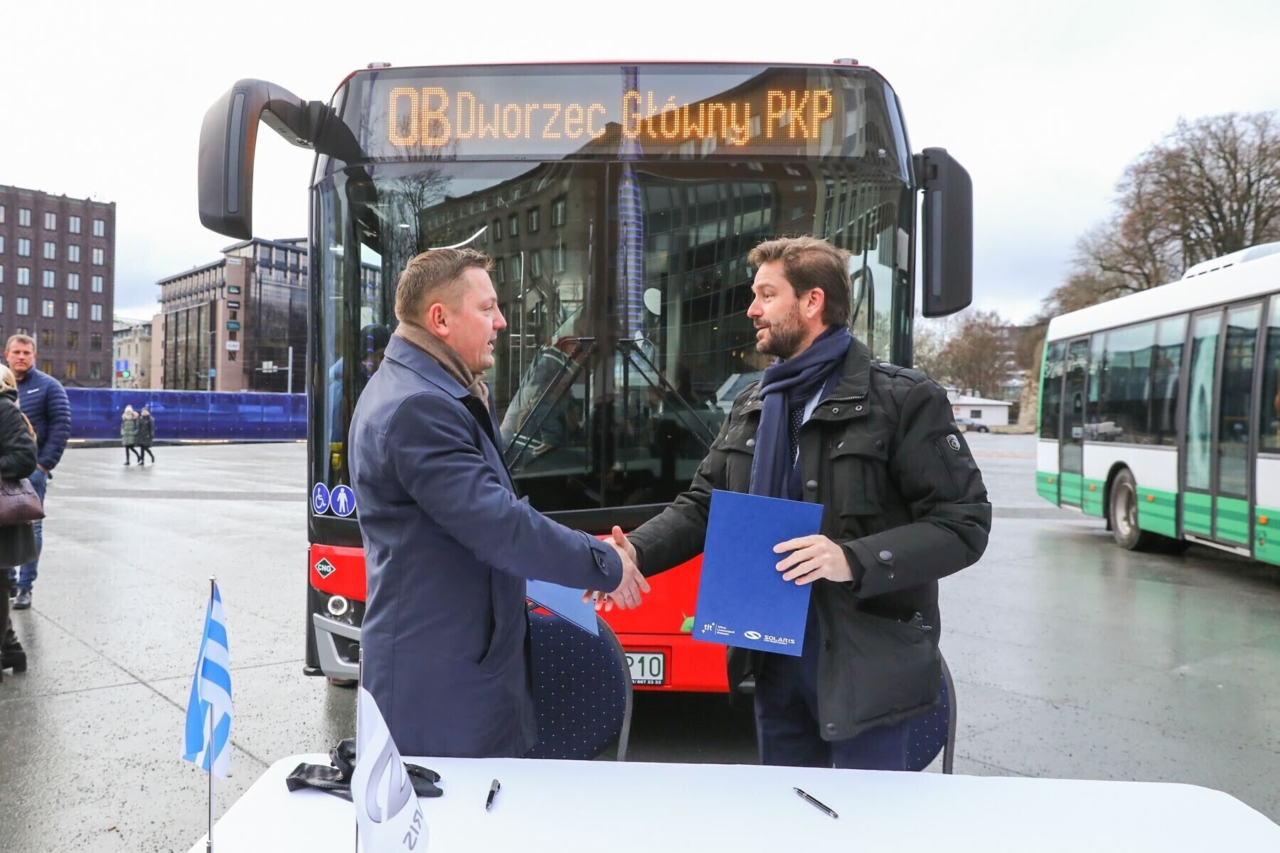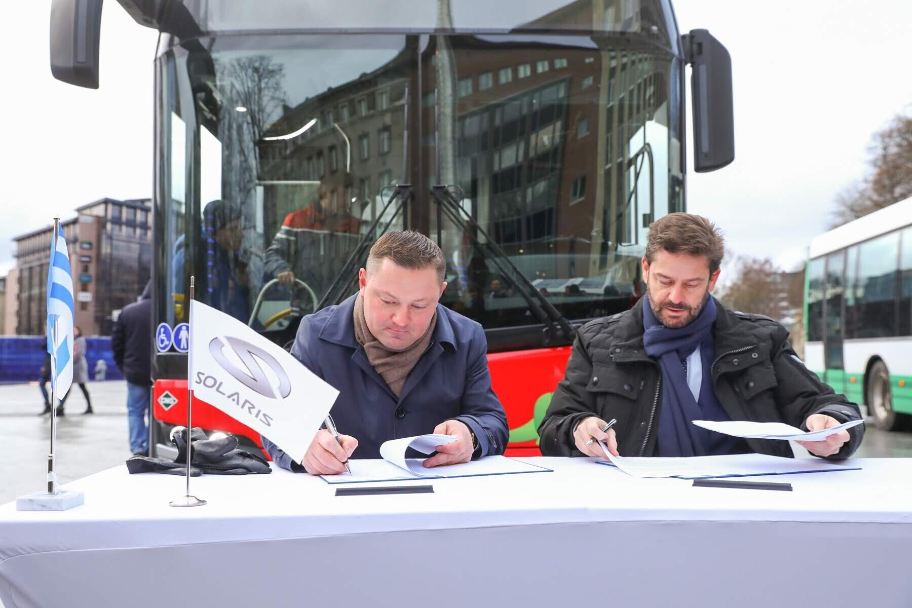 Chairman of the board of Tallinn City Transport (TLT) Deniss Boroditš, and chairman of the bus manufacturer Solaris Javier Calleja signed the agreement at Freedom Square.