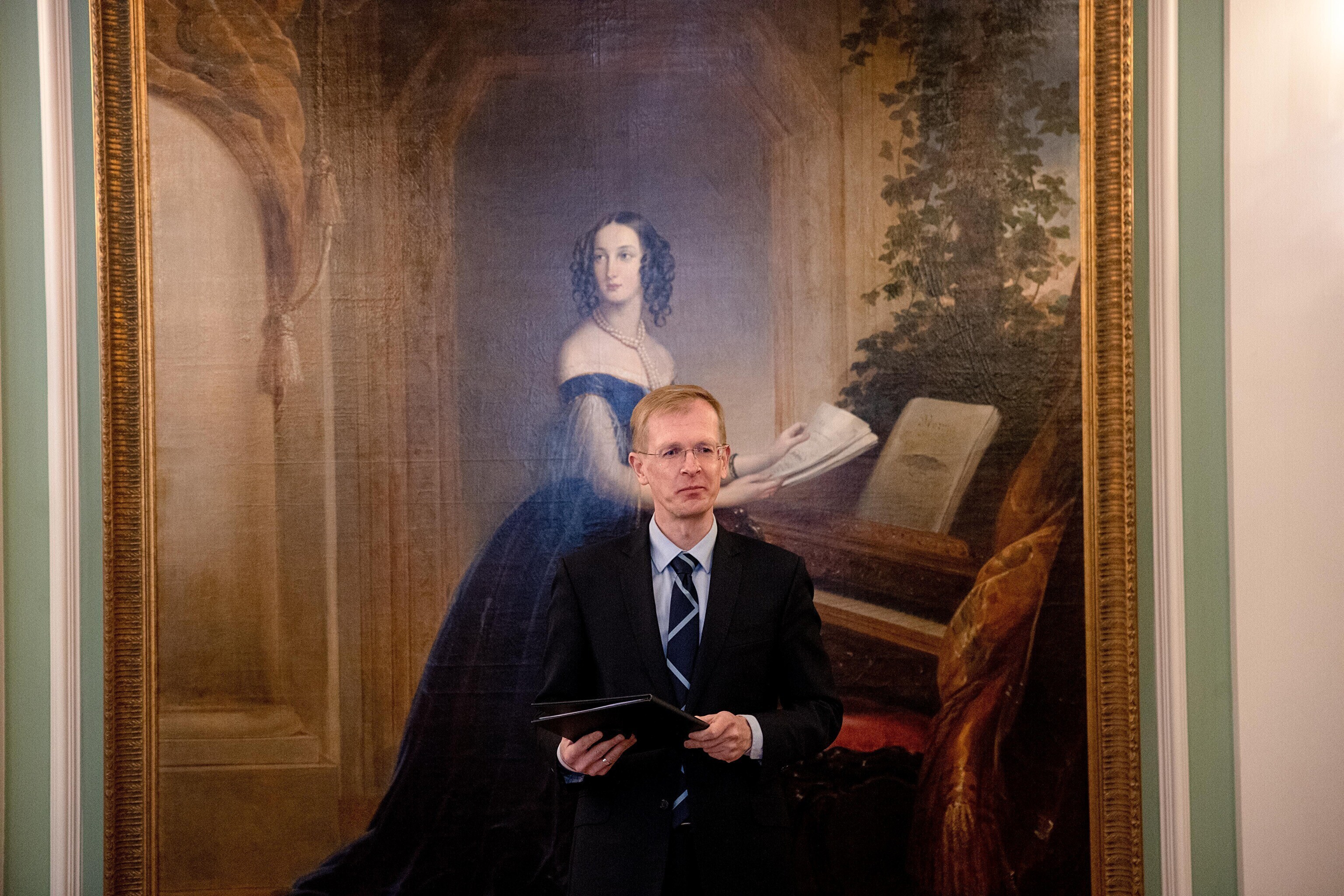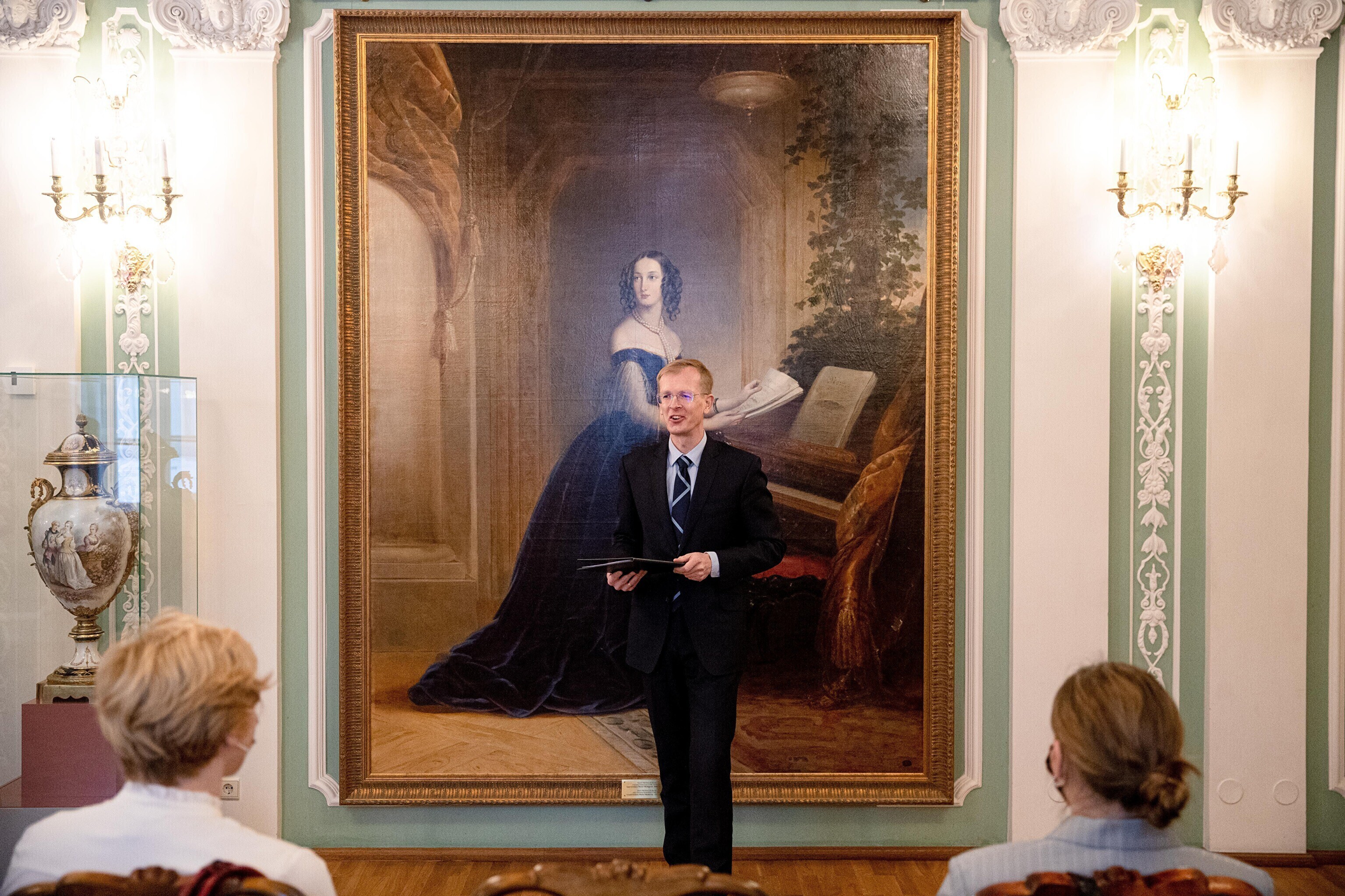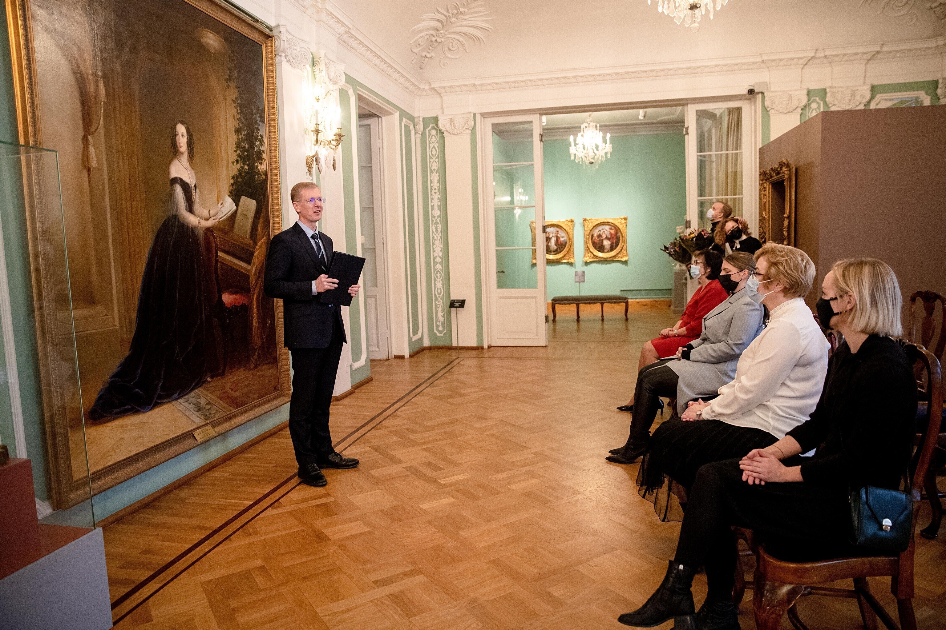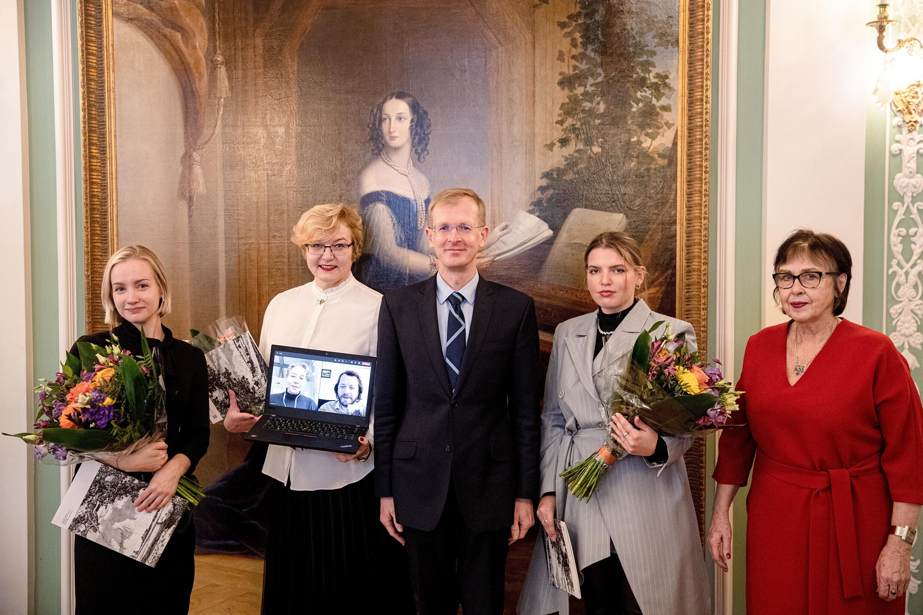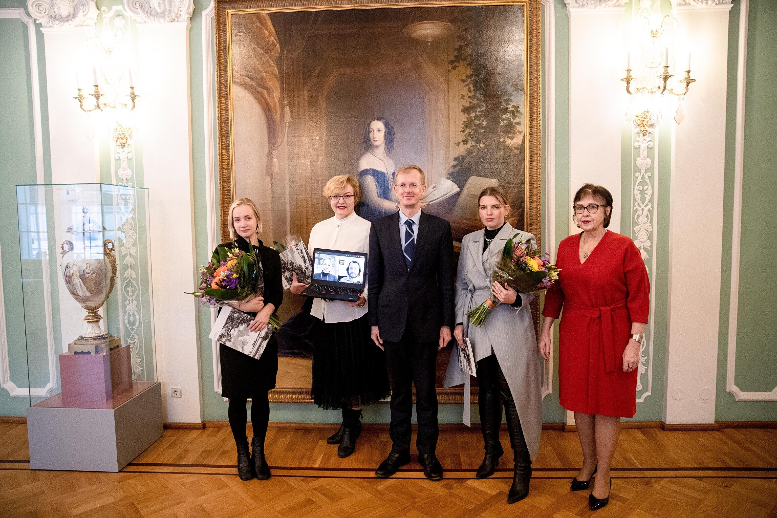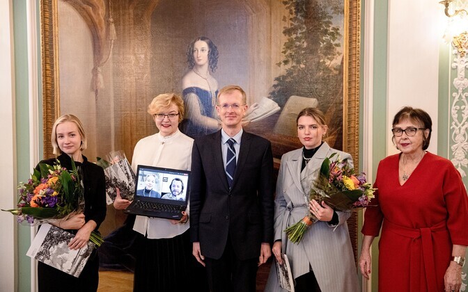Minister of Culture Tiit Terik (Center) handed out the Eduard Wiiralt scholarship to four art students in the Kadriorg Art Museum on Wednesday.