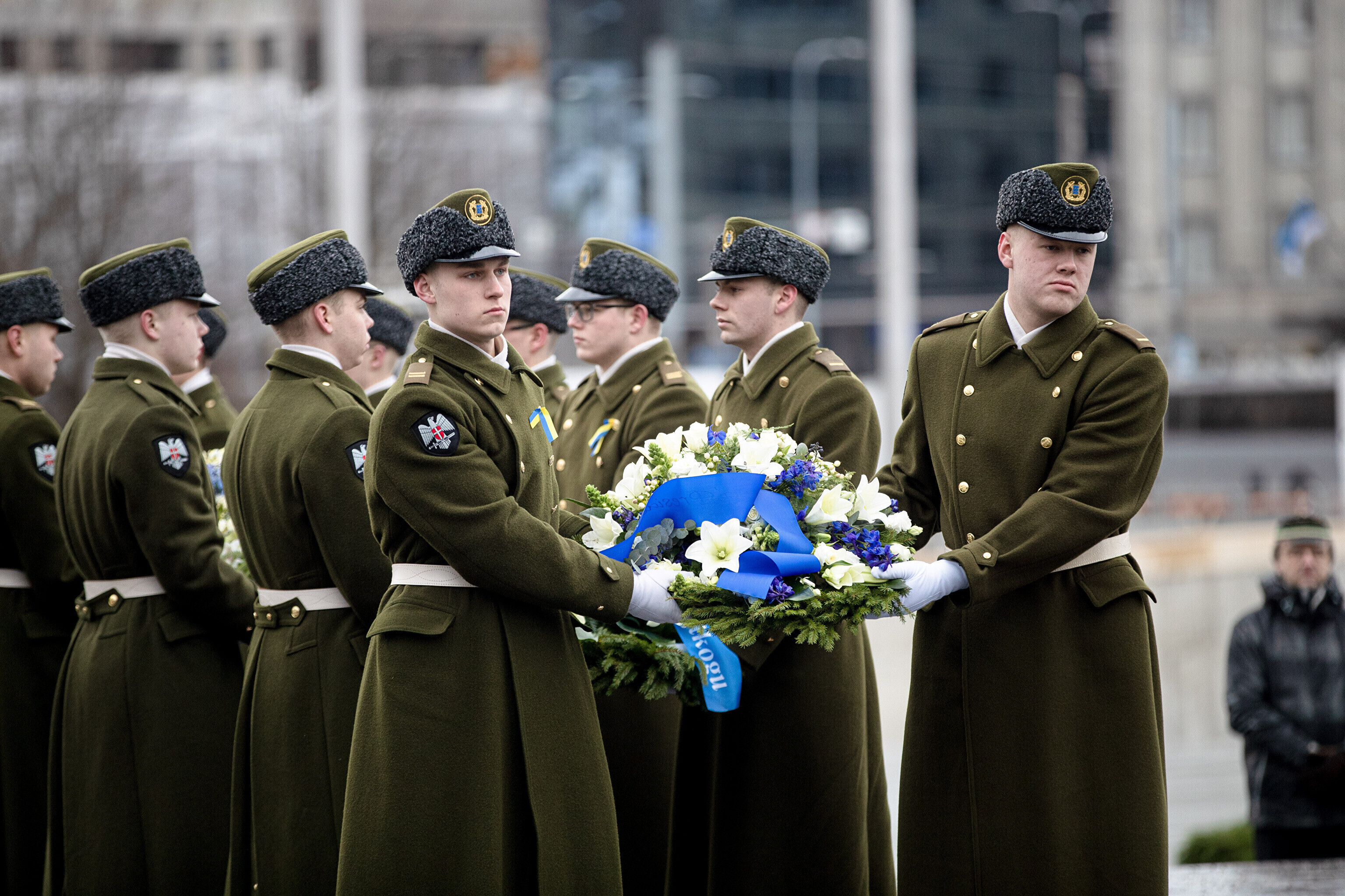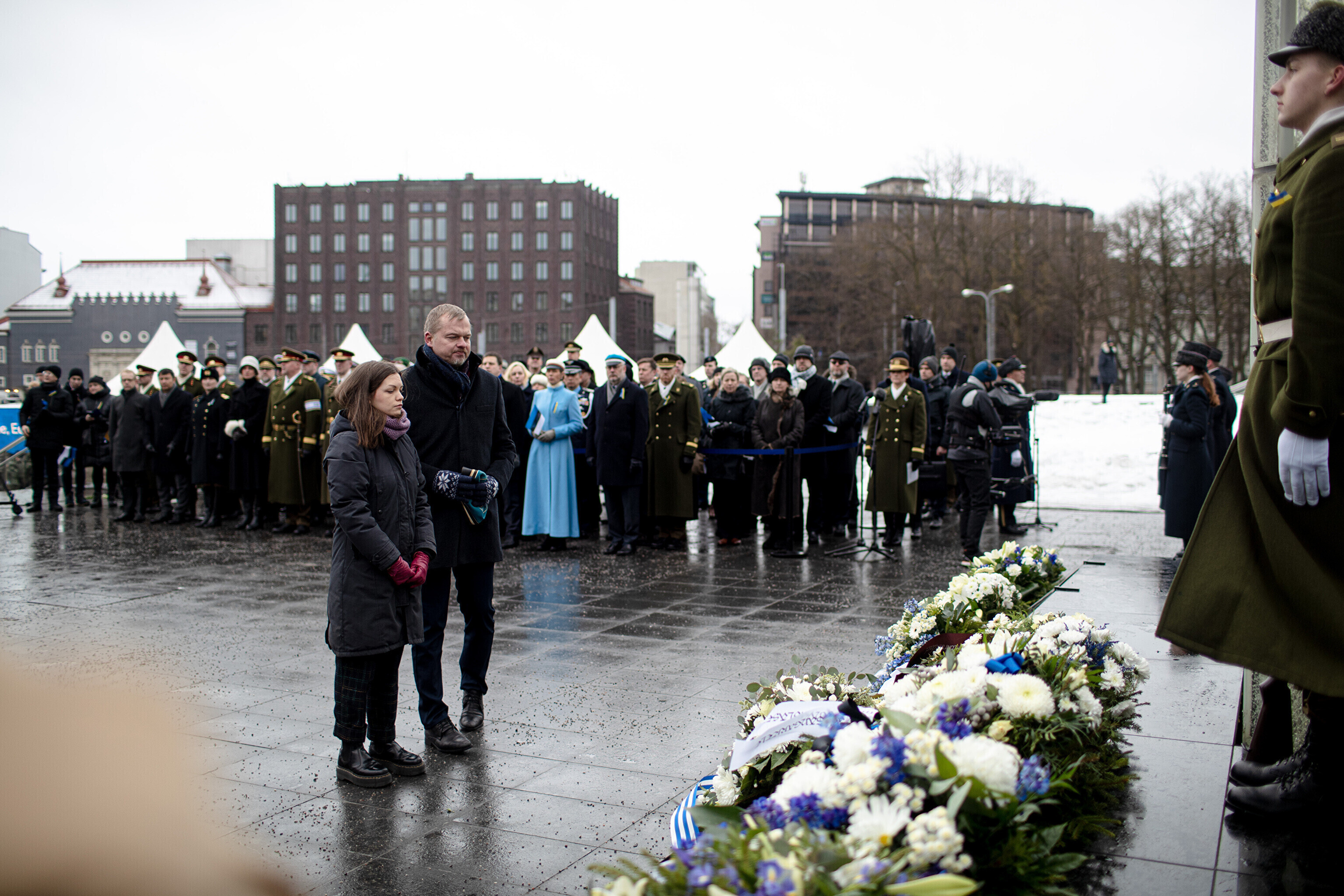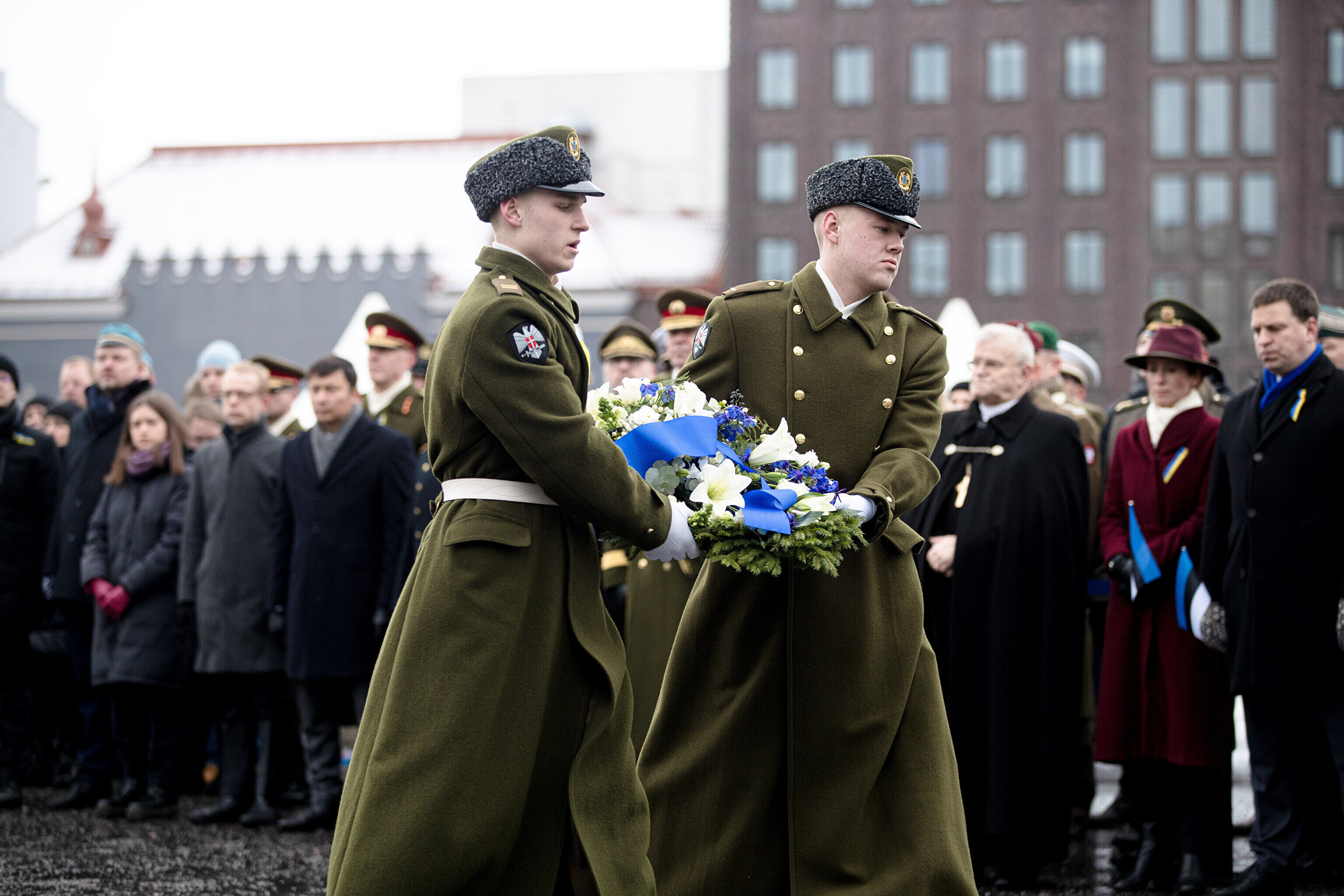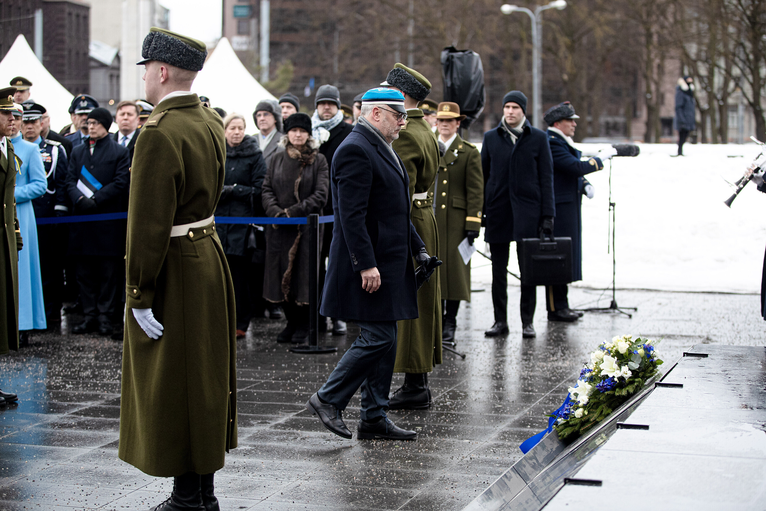 The Estonian president, prime minister and other officials laid wreaths at the War of Independence Victory Column on Freedom Square on Thursday, the 104th anniversary of Estonian independence.