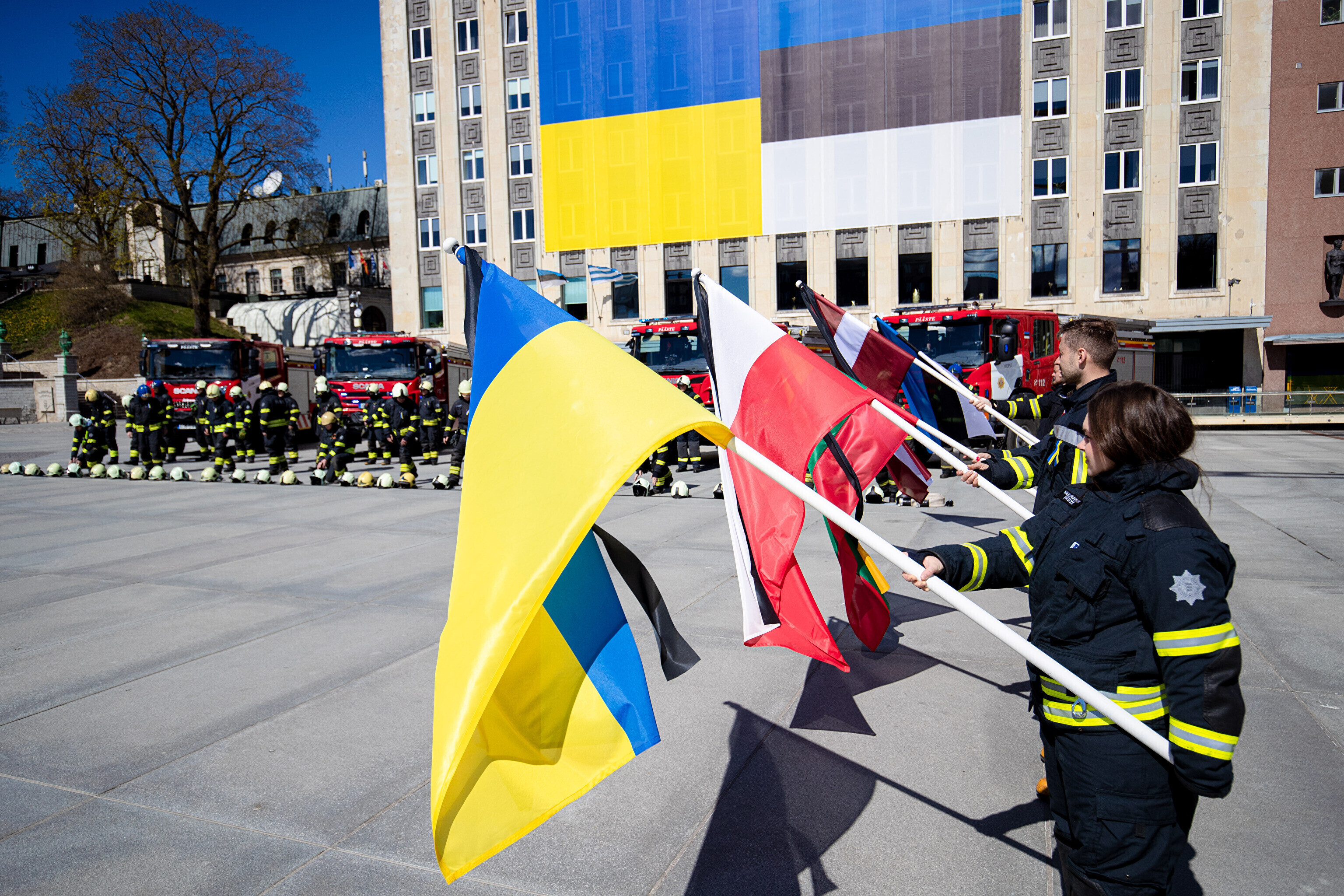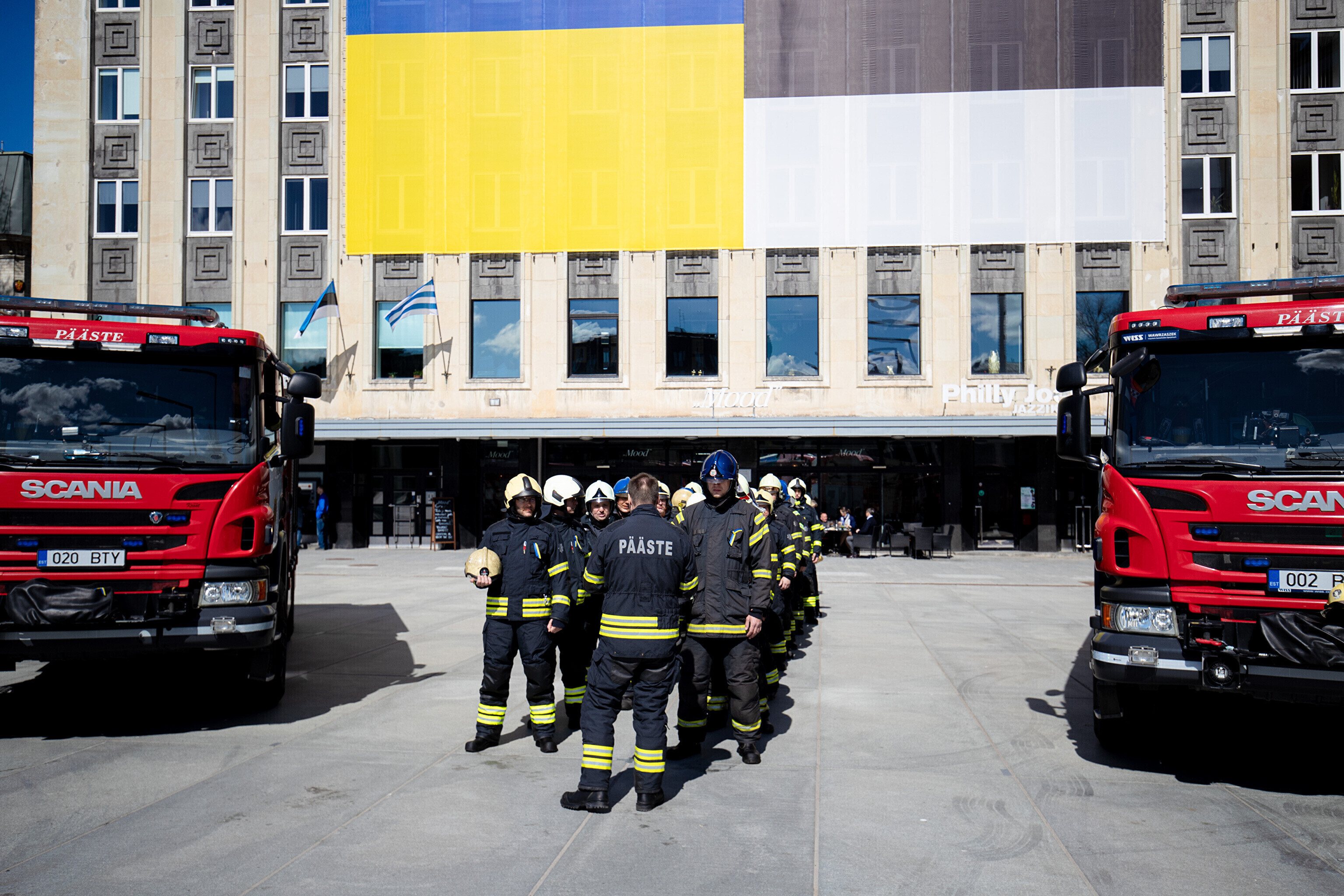Rescue workers gathered with their firetrucks beneath a huge banner of the Ukrainian and Estonian flags hung by Tallinn City Government several weeks ago.