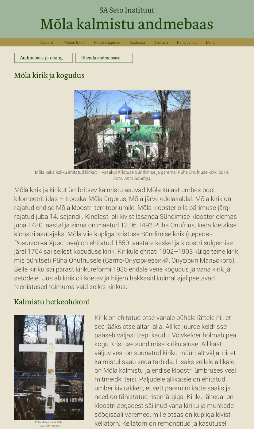 The idea for the database came about thanks to Triin Parts, who was working as a consul in Pskov. Parts was interested in the history of the region and wanted to record the burial sites of Estonians and Setos on the Russian side of the border.