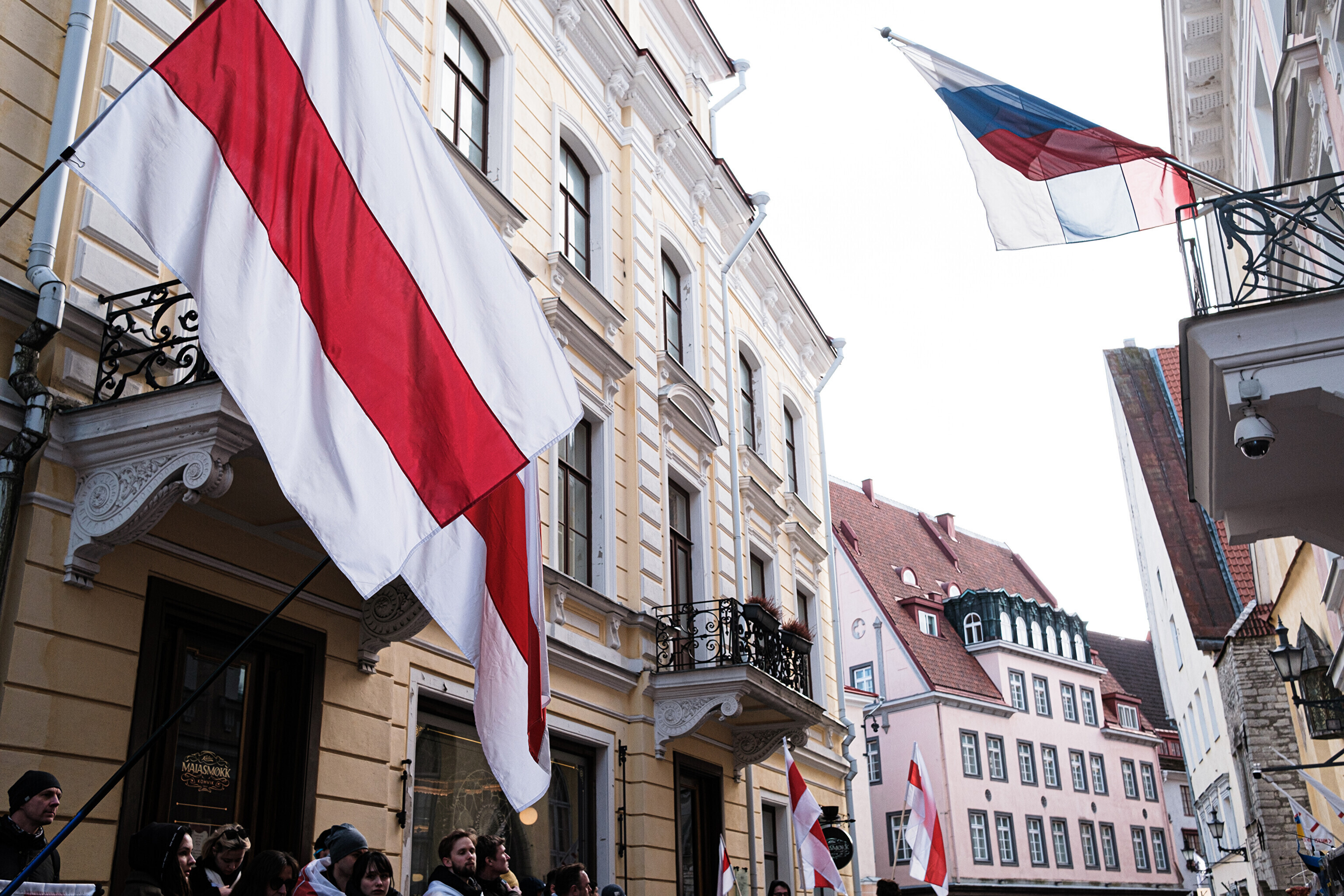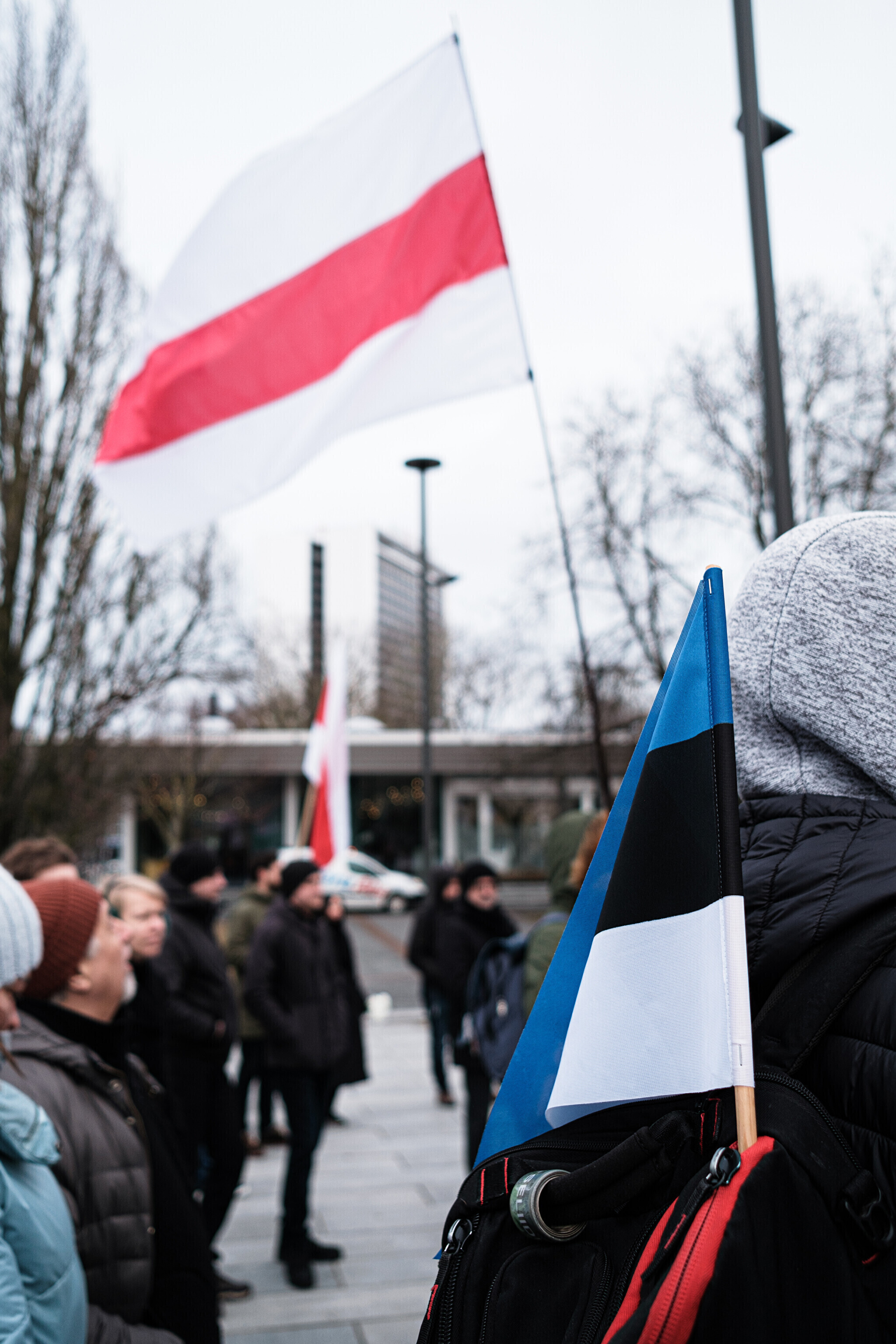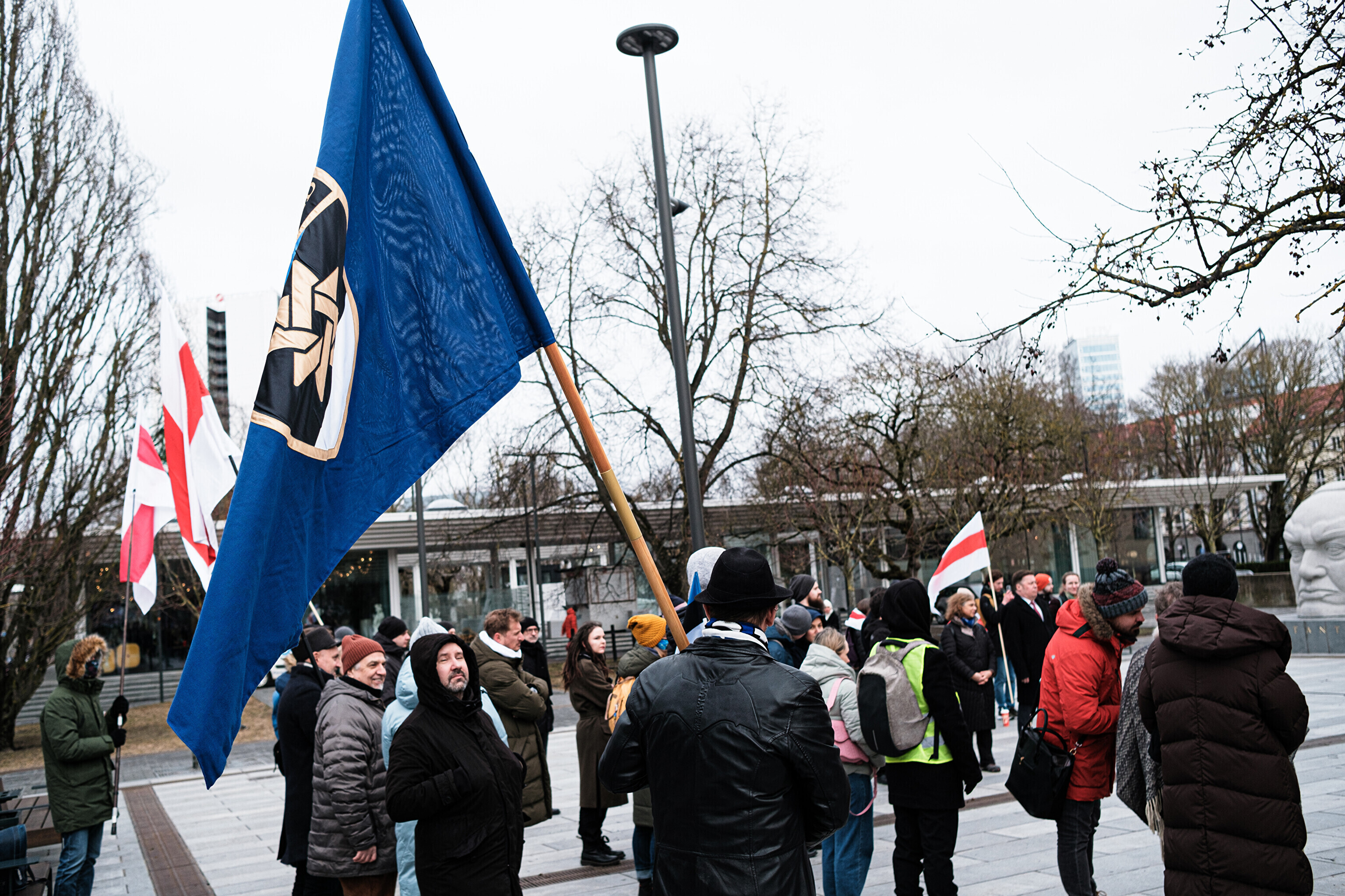 Dozens of people holding red and white flags, the flag of independent Belarus and a symbol of the opposition movement, gathered at the monument to Estonia's first president, Konstantin Päts, in Tammsaare Park on Saturday afternoon.