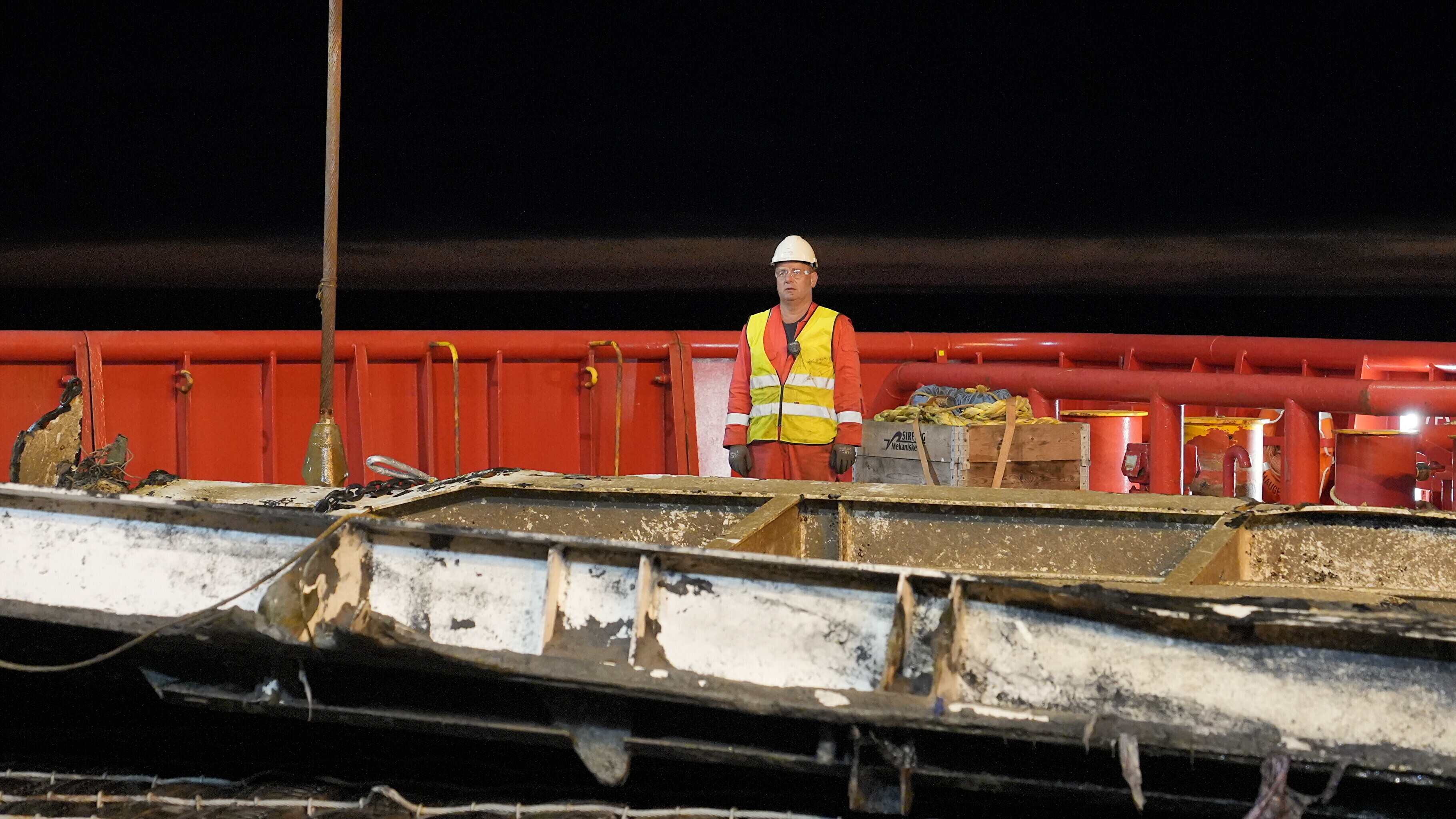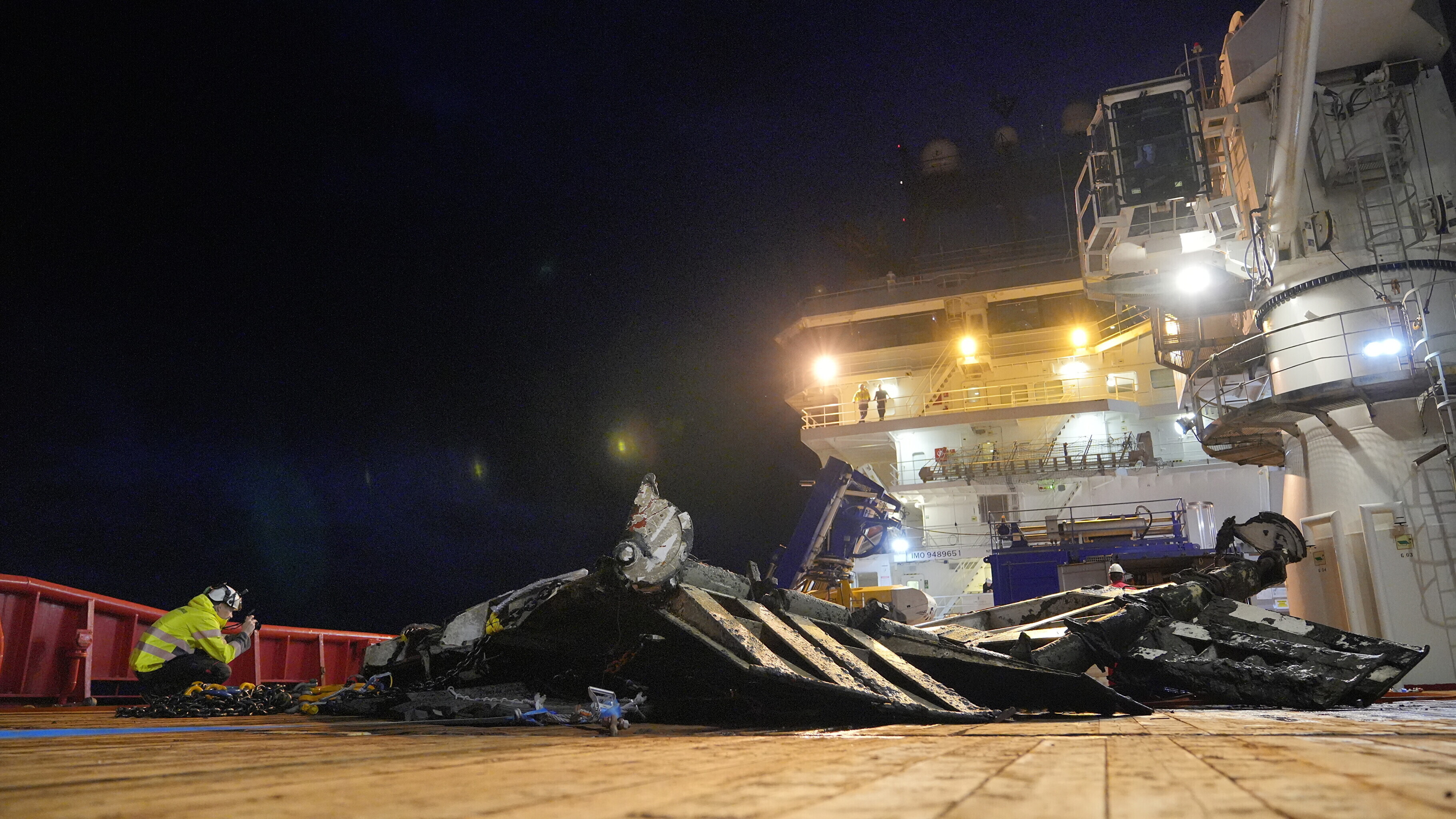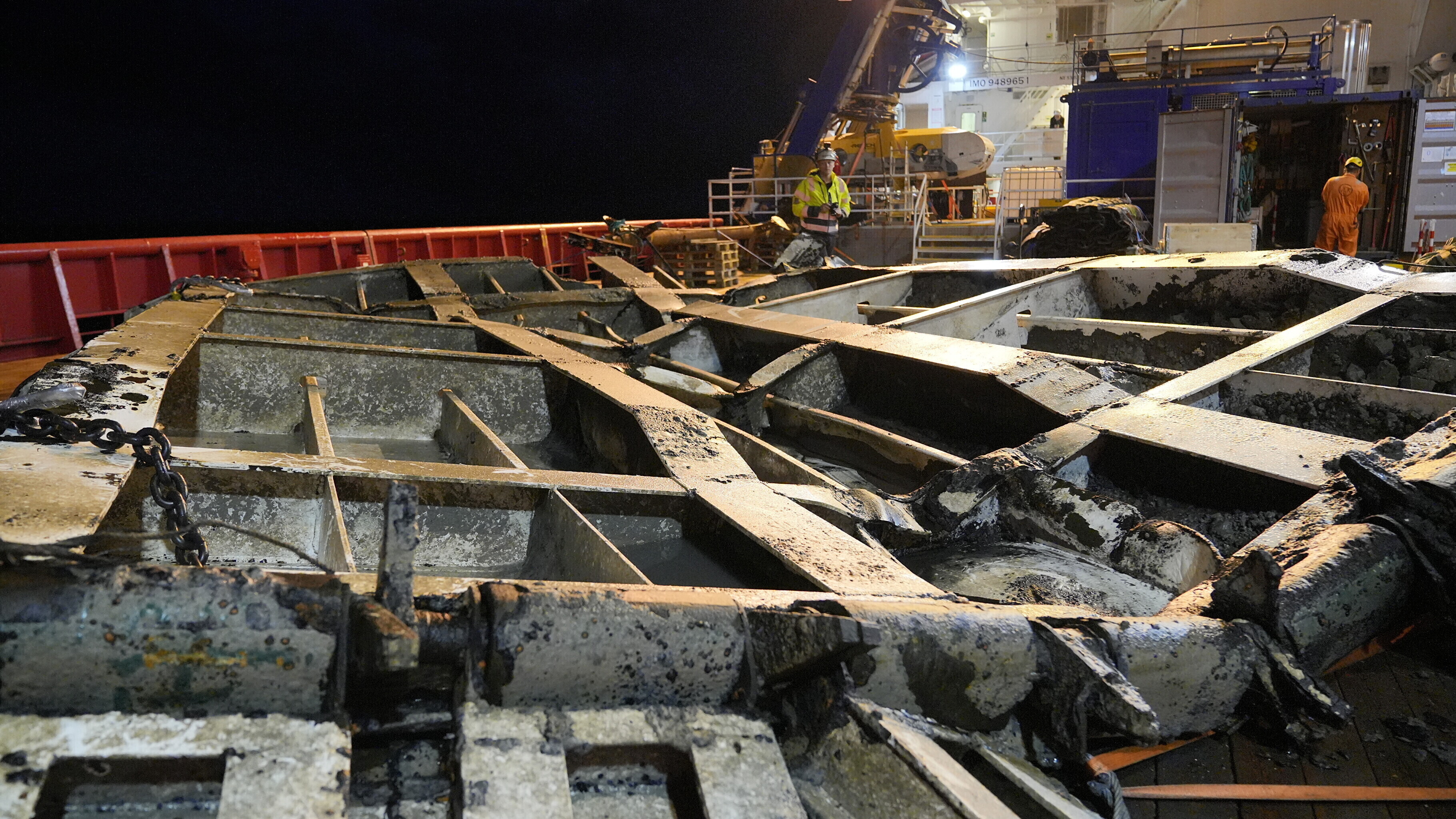 Tauri Roosipuu, the OJK's lead expert on board the Viking Reach, said dredging work had gone on all day Monday, to facilitate bringing the ramp up to the surface, while a bit before midnight, the securing process began, ahead of safely lifting the time.