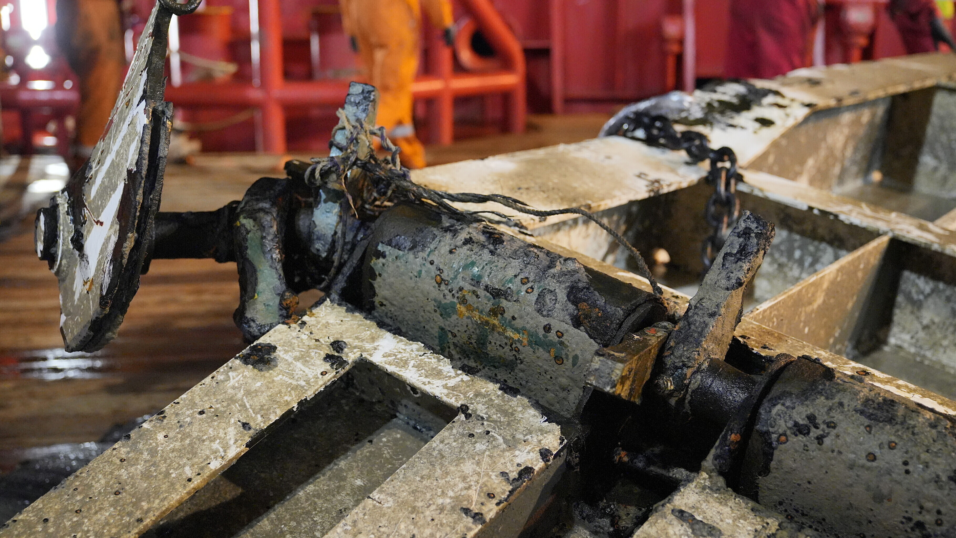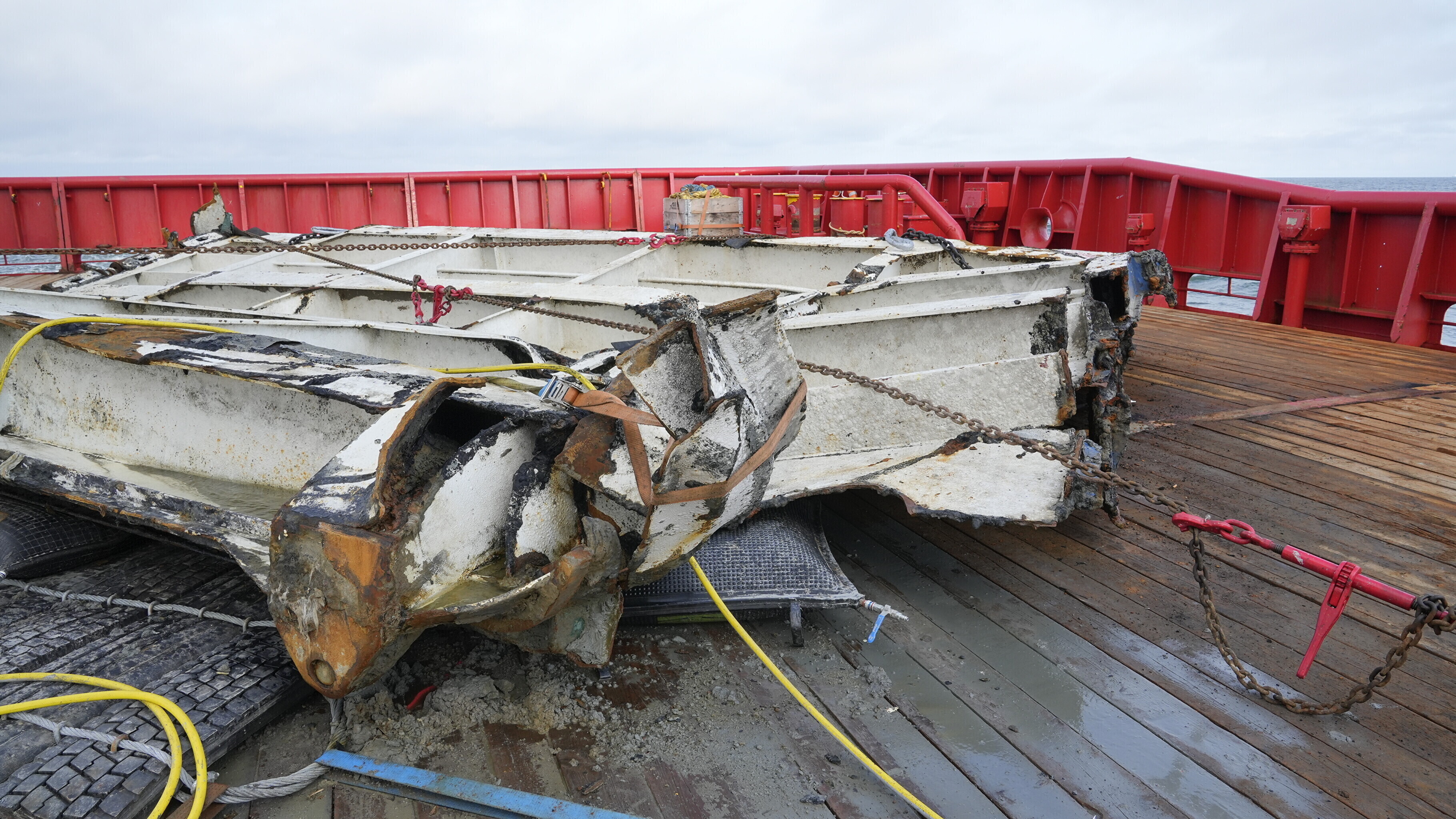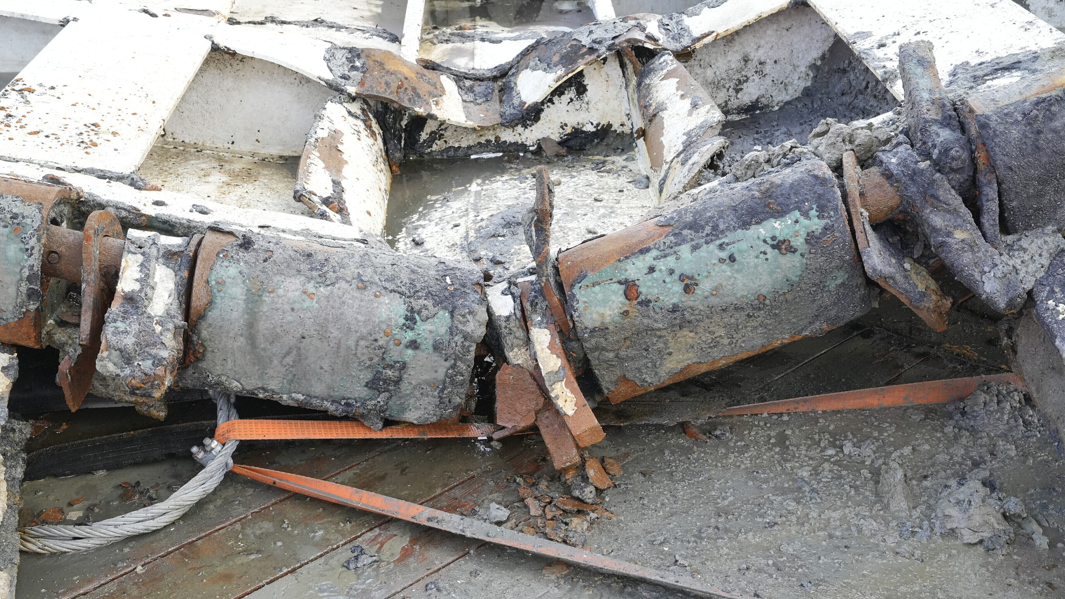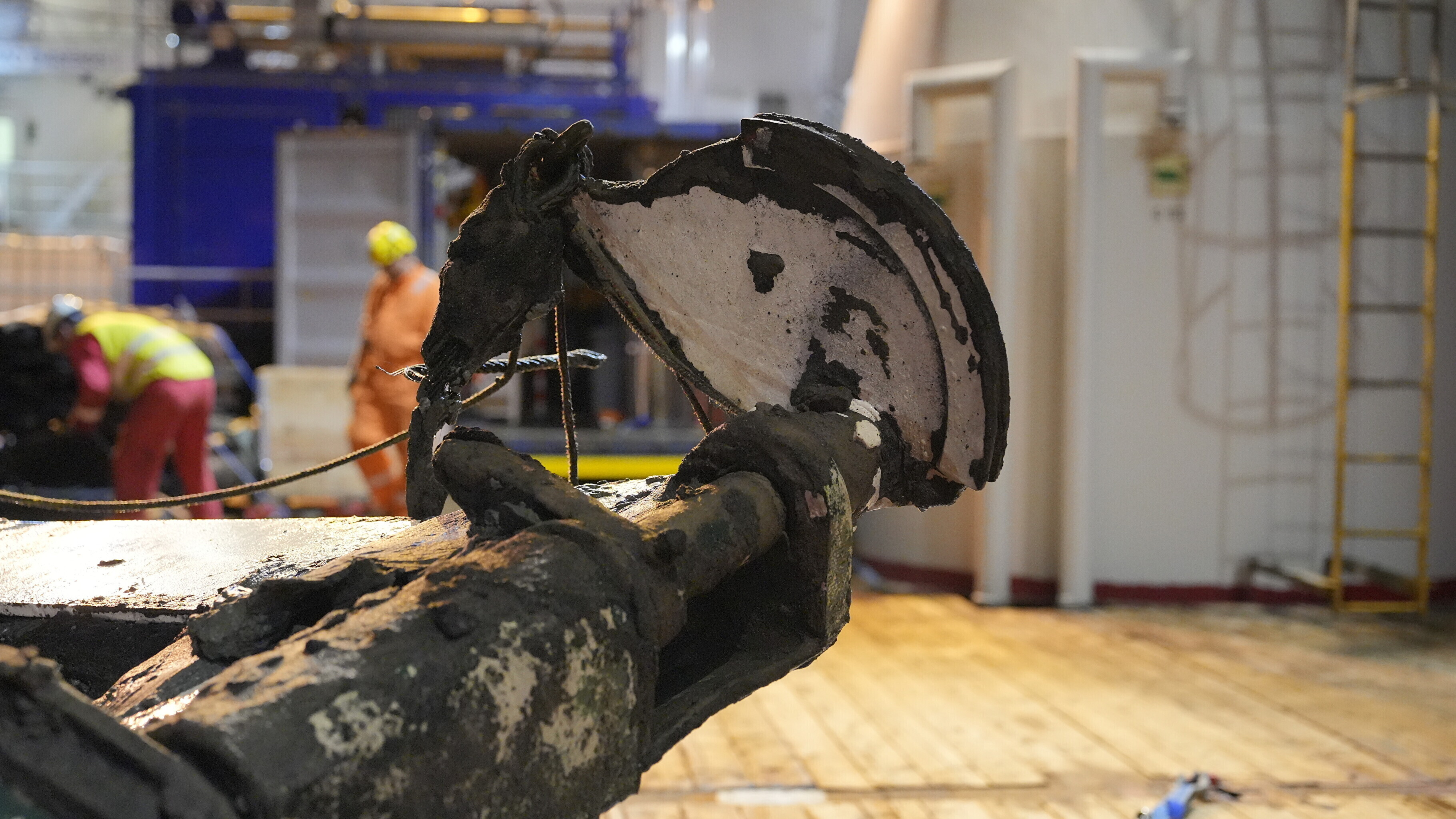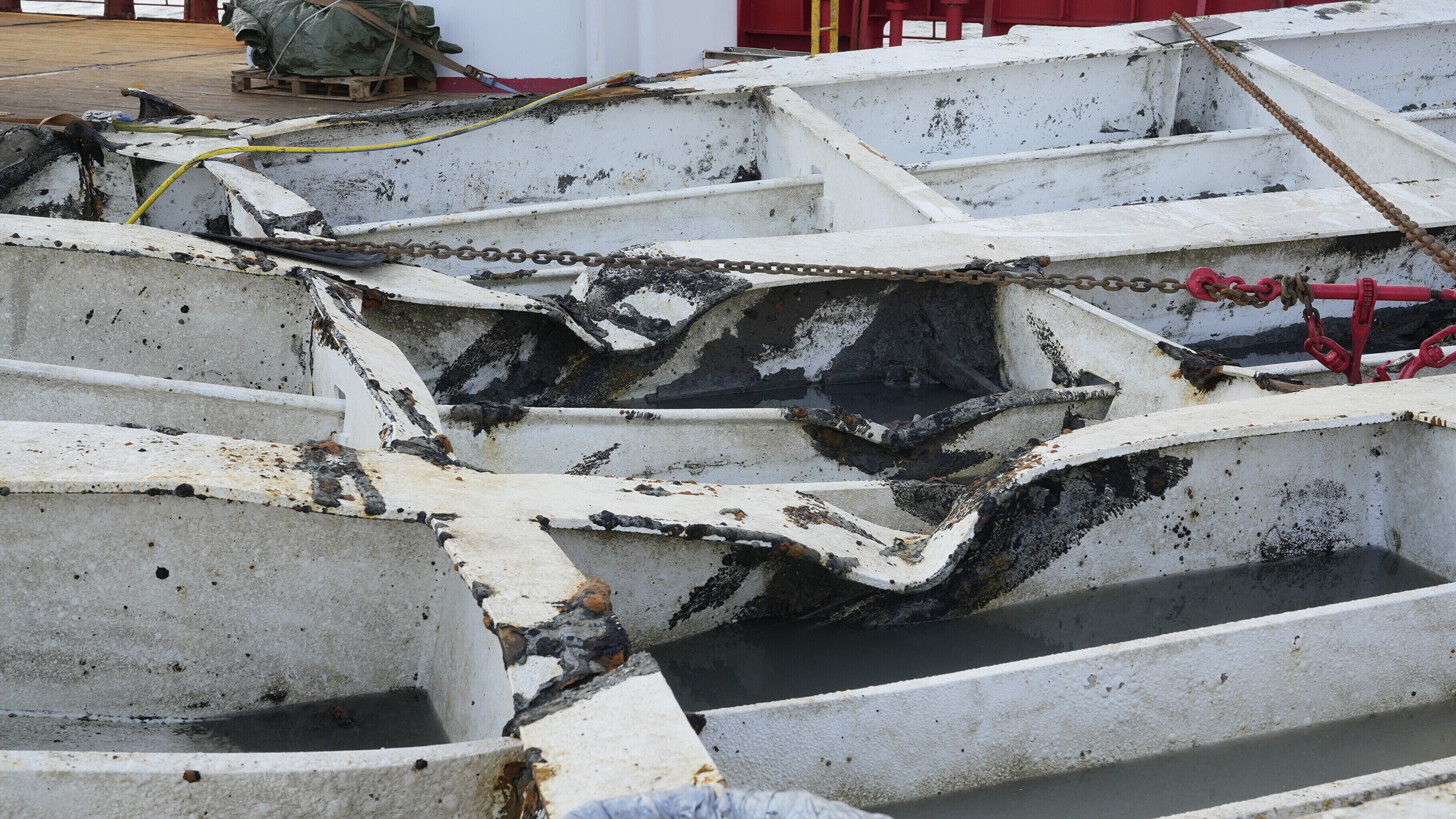 Cut-out pieces of the port side plating, extricated by divers in late 1994 in order to examine the interior of the wreck and left in situ, were also recovered.