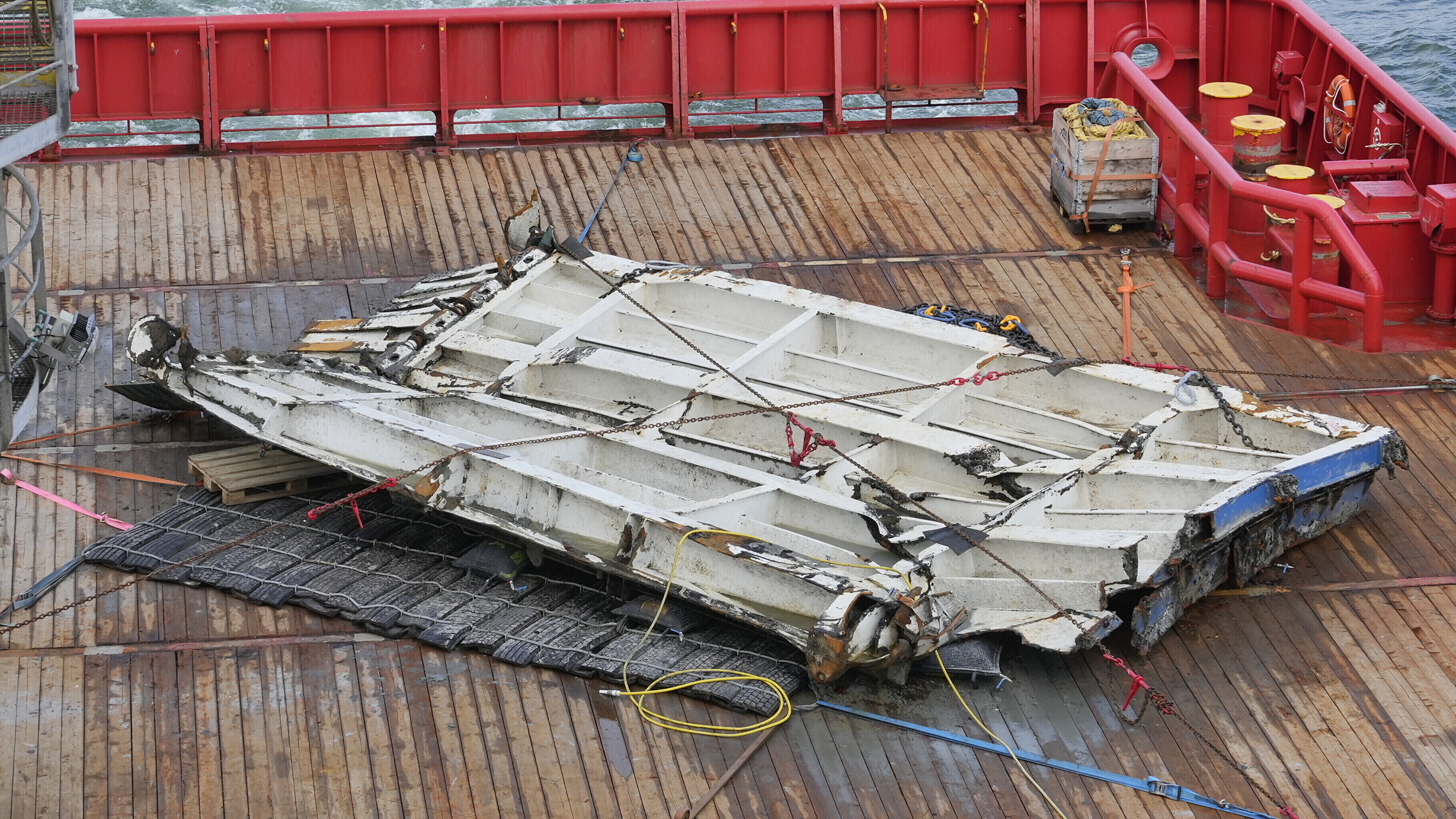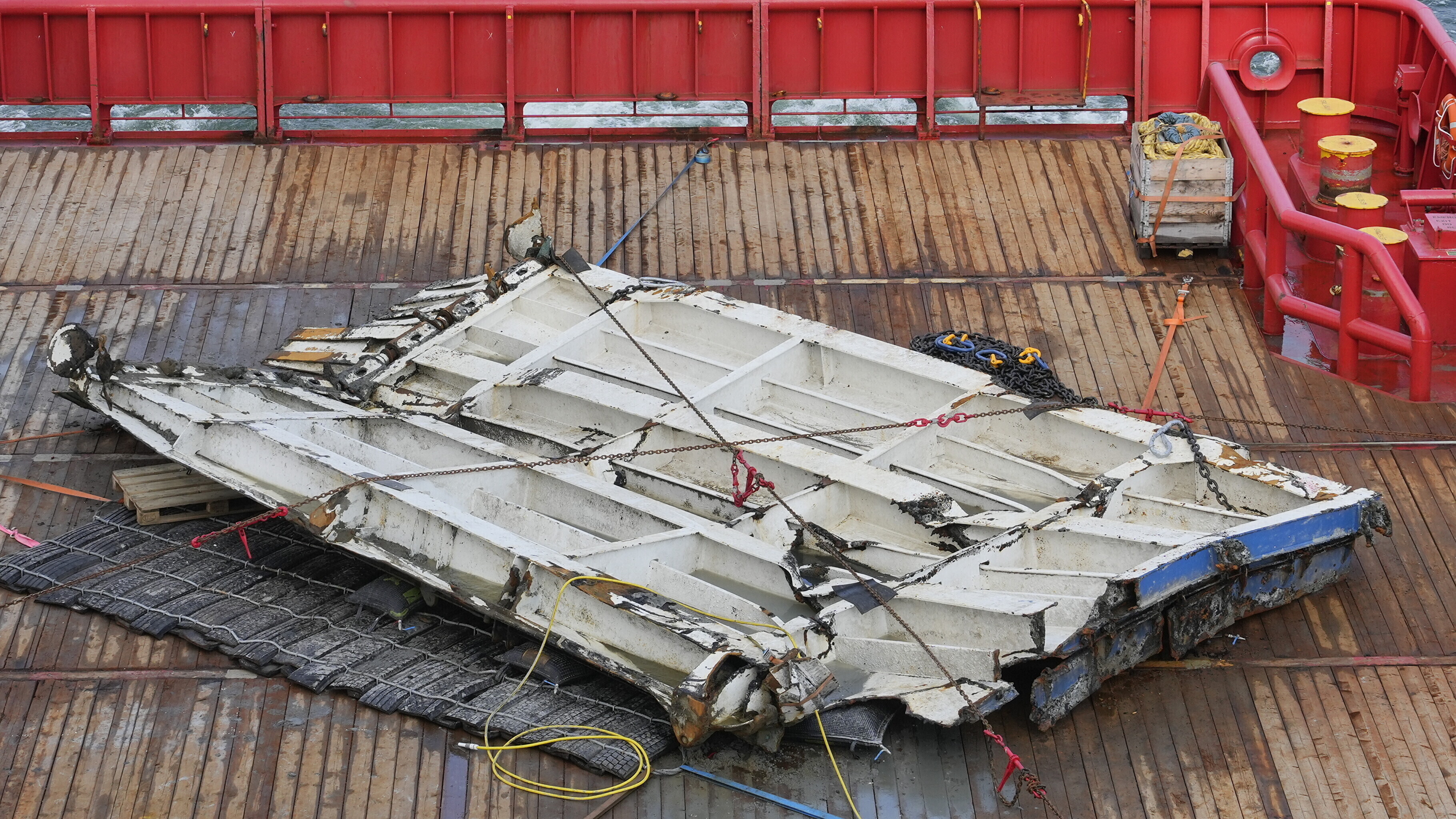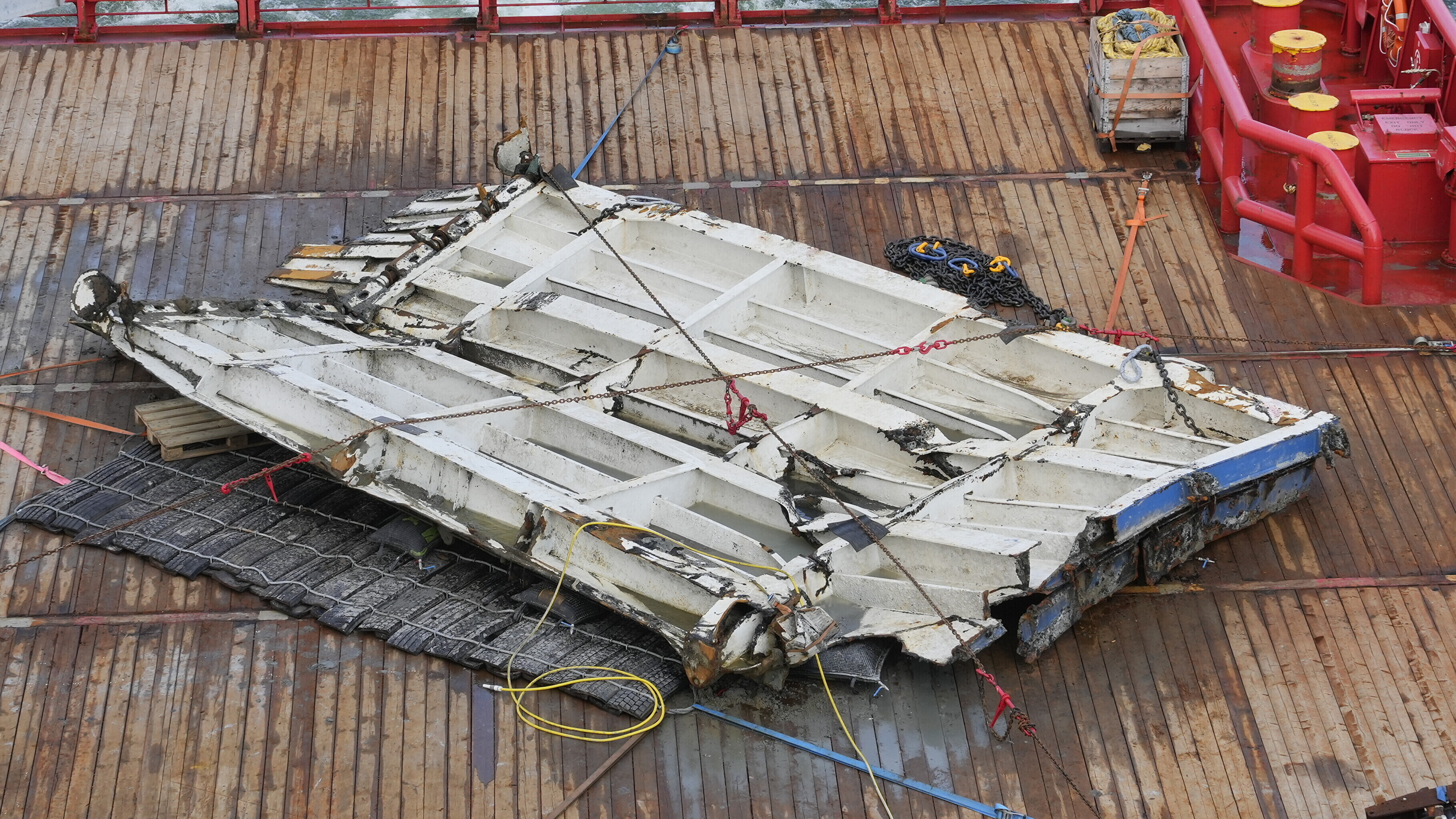 A steel sample from the damaged starboard side of the ferry's hull was also obtained, as was cabin window glass and seal.