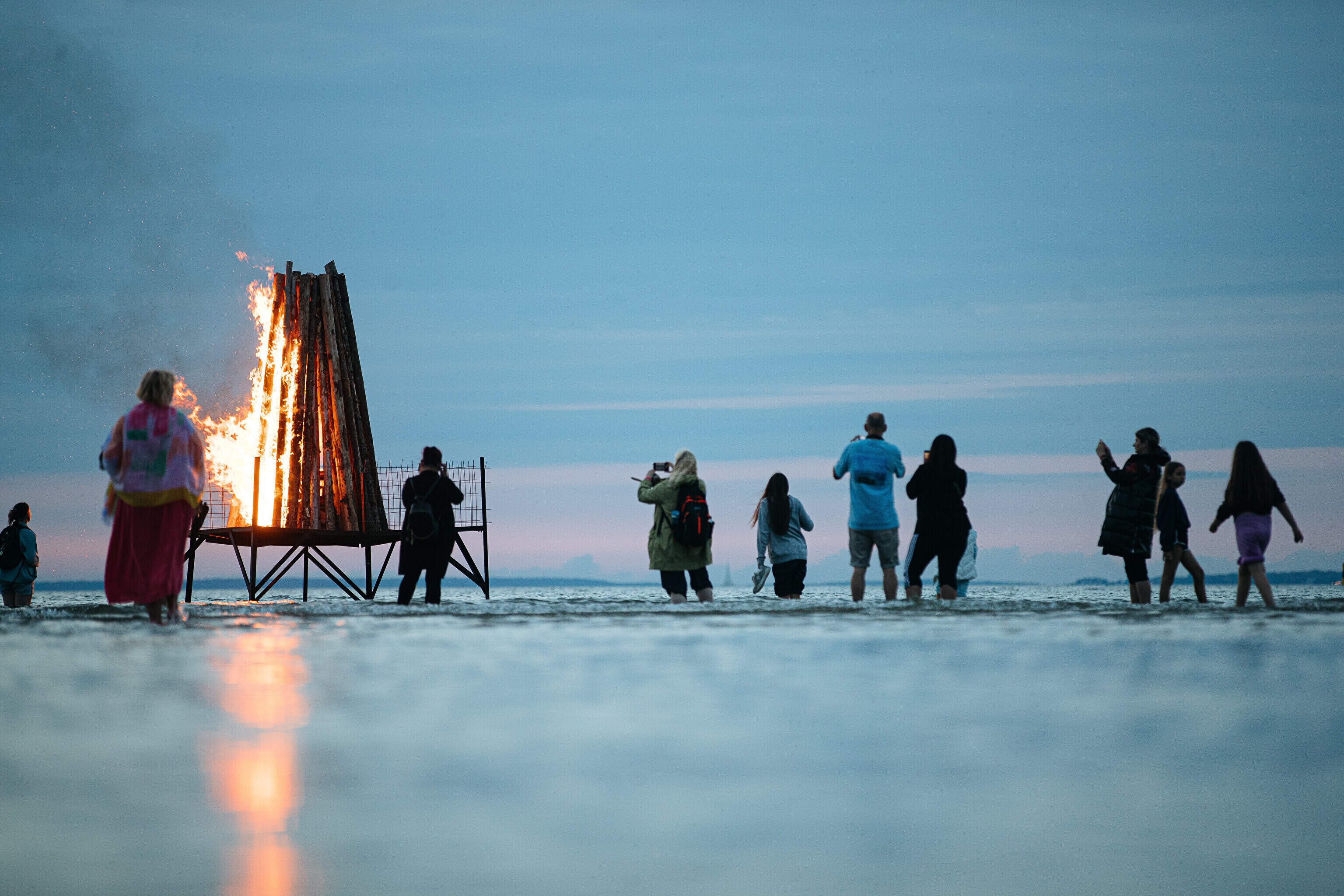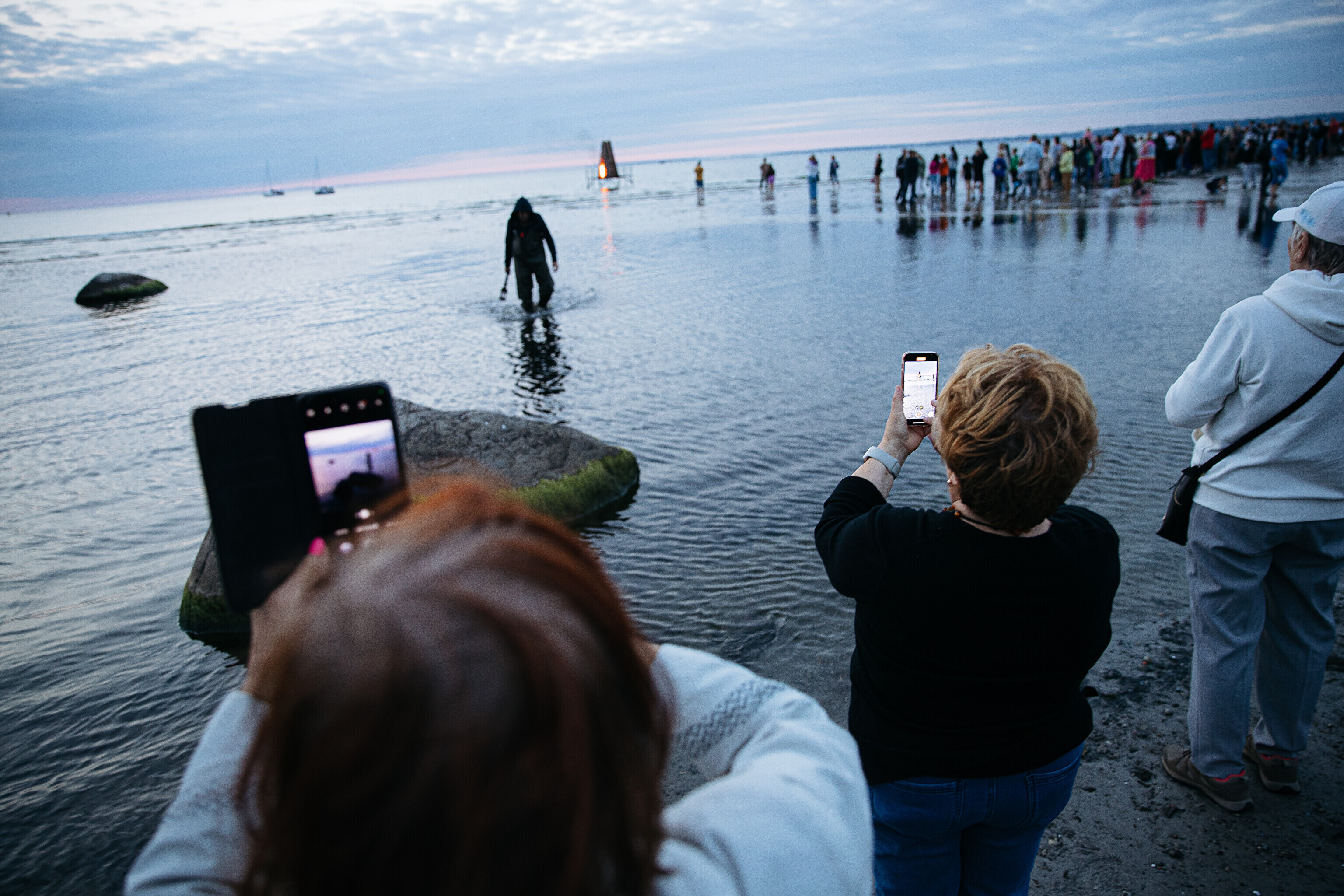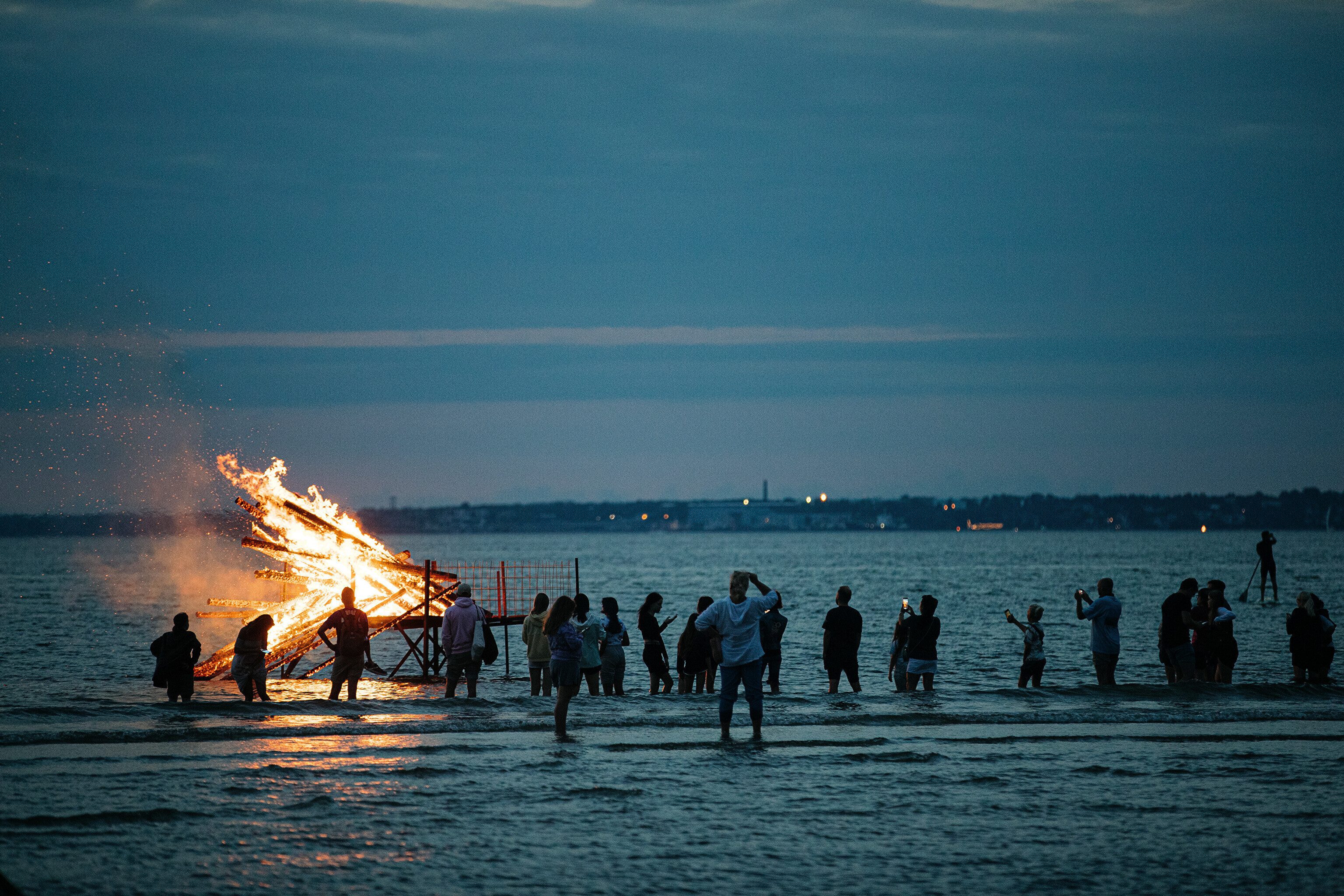 In addition to several bonfires that popped up along the shoreline, one of the fires lit at sundown was surrounded by water.