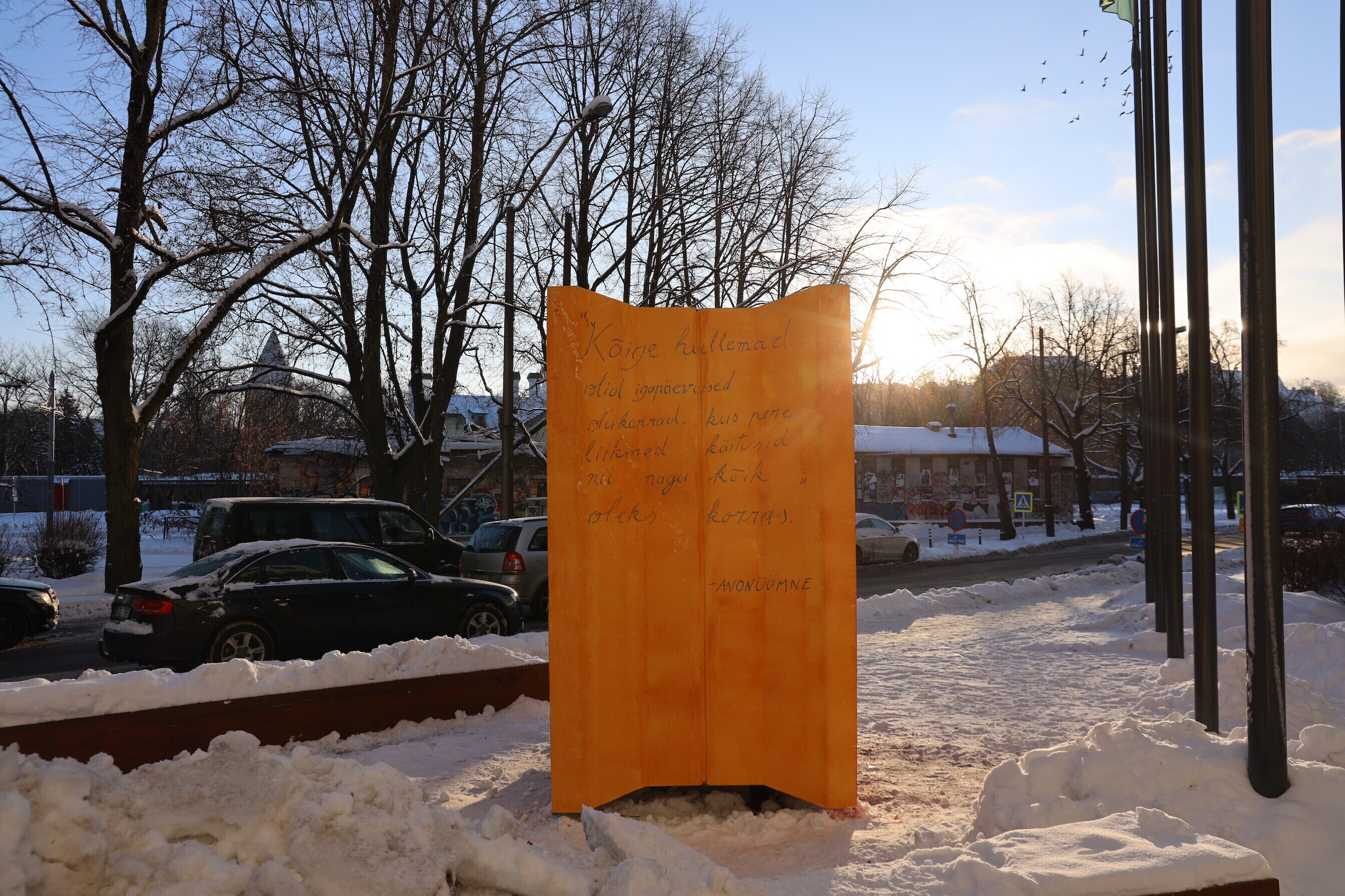 An artwork highlighting intimate partner violence is on display outside the Estonian Academia of Arts (EKA) in Tallinn to raise awareness of the social problem.