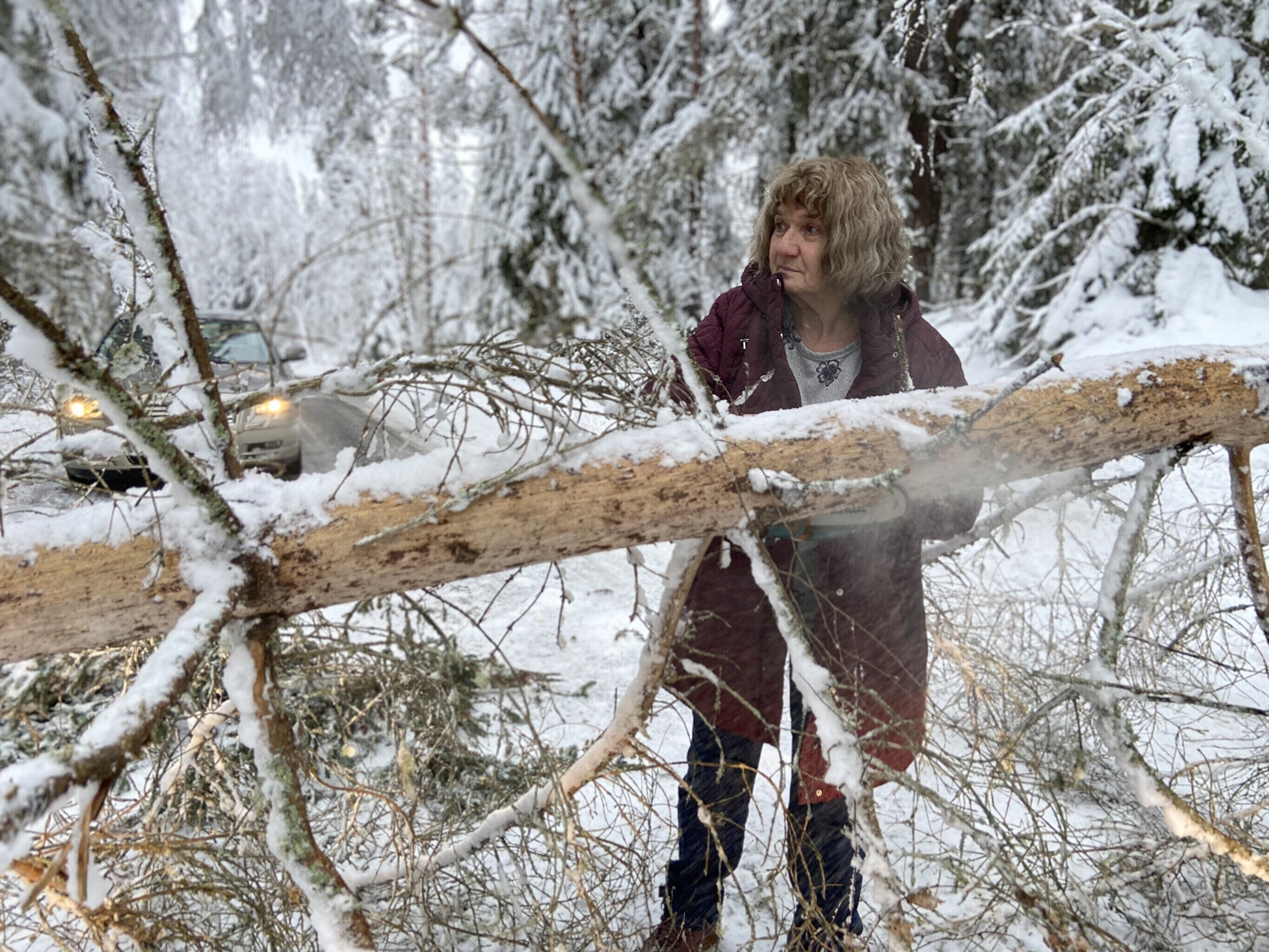 "Children call home and say that it looks like the bus isn't coming. We start up the car, put the chainsaw in the trunk and take the kids to school. But we've let them stay home the last couple of days because we cannot spend all that time sawing in the mornings," local resident Meelika Hainsoo said.