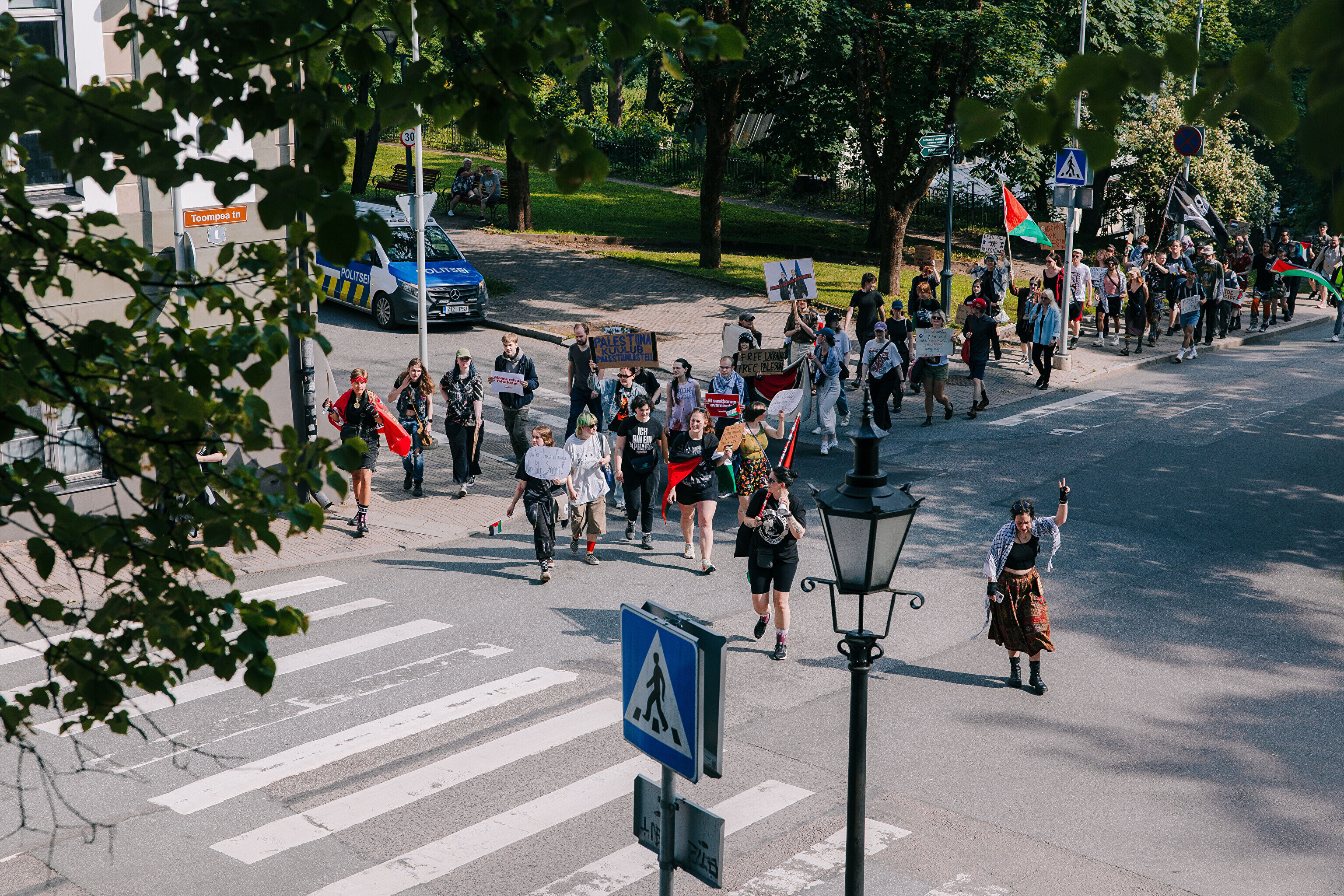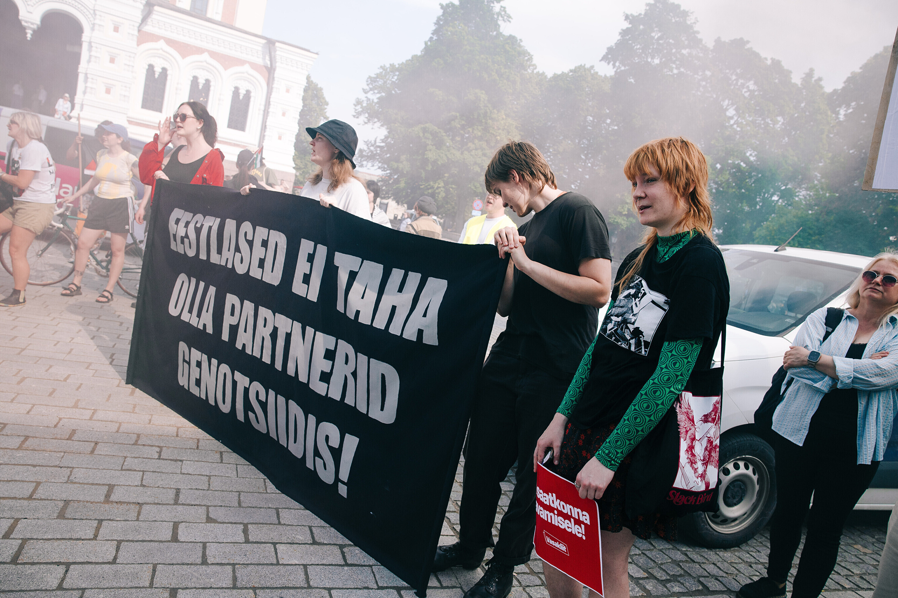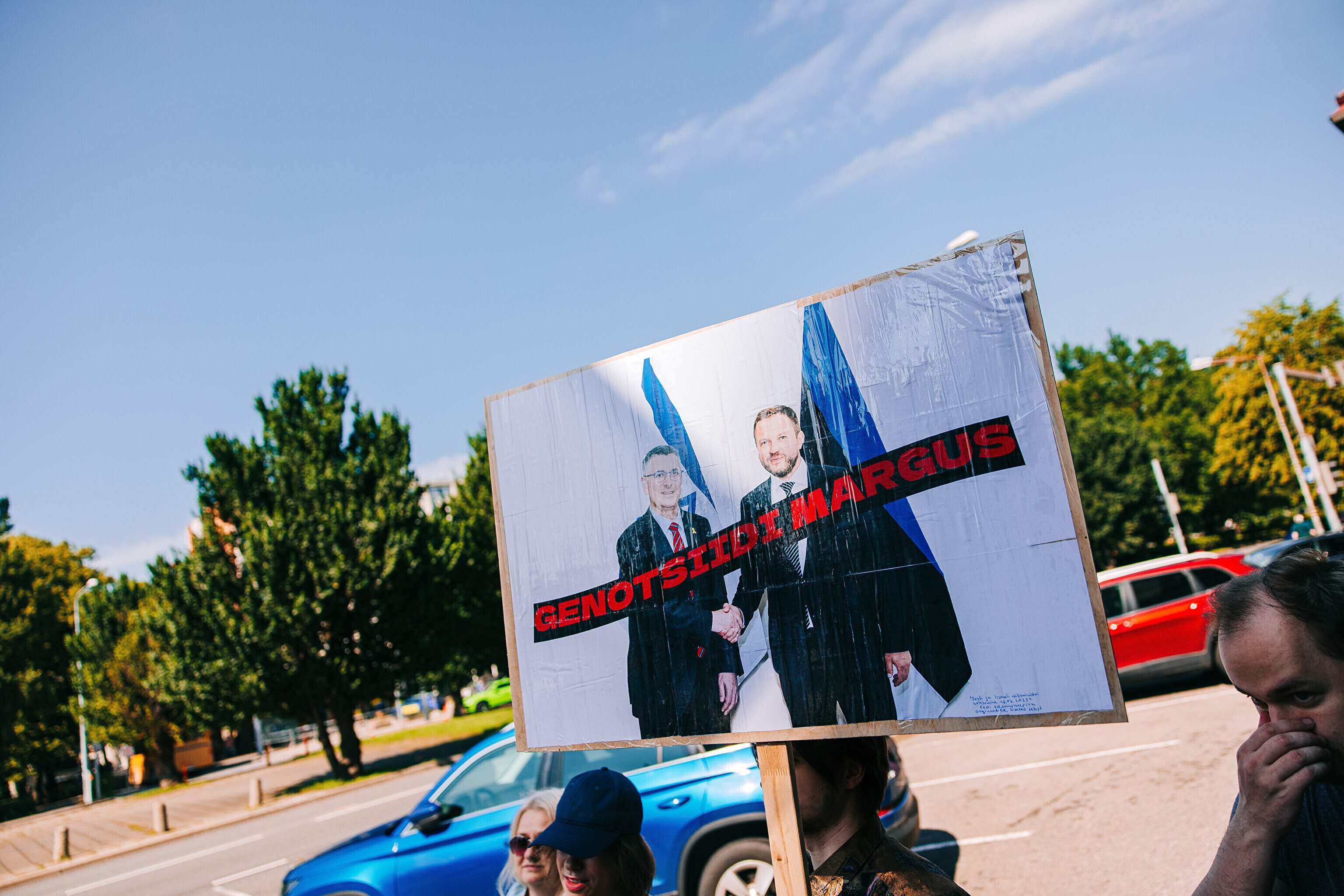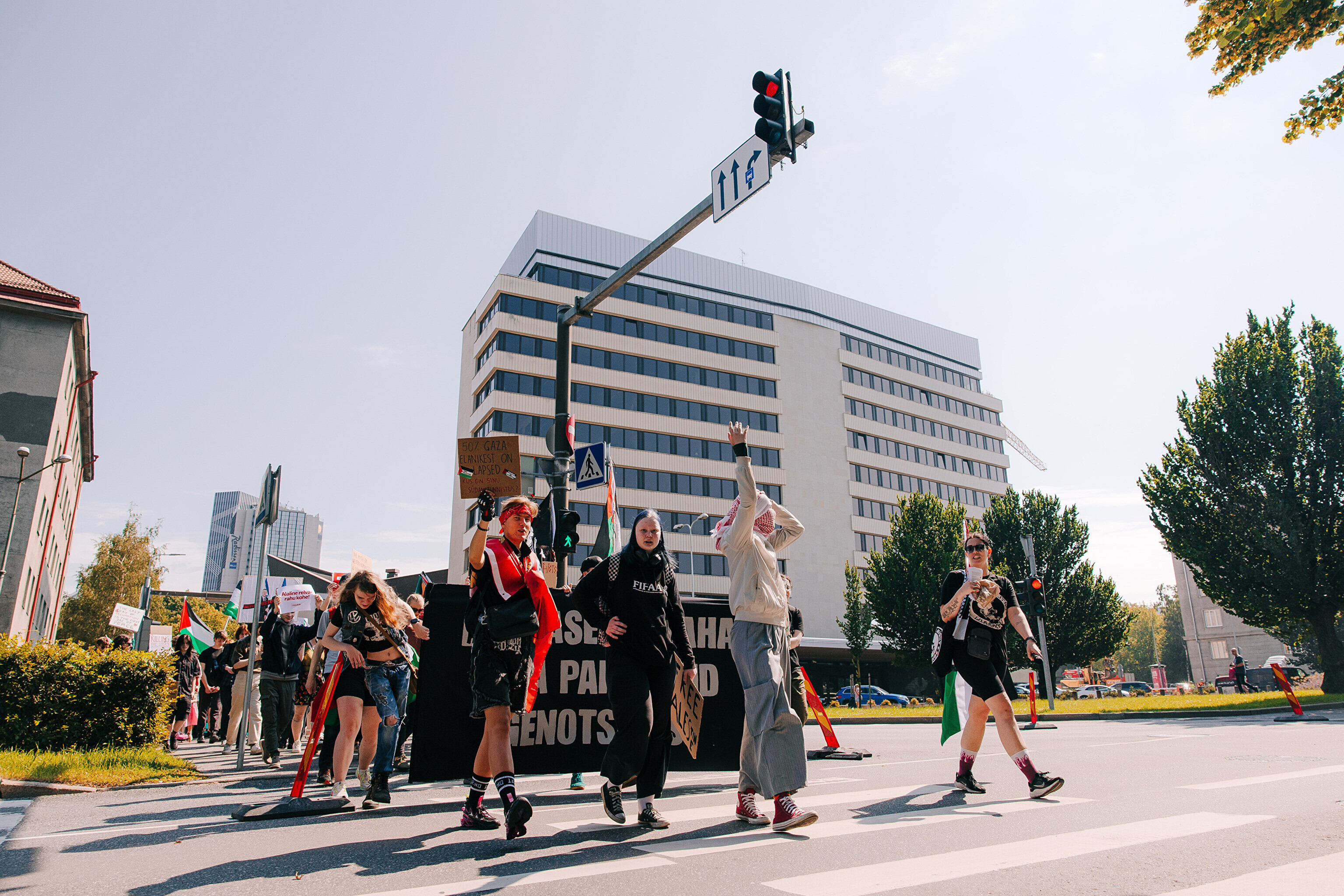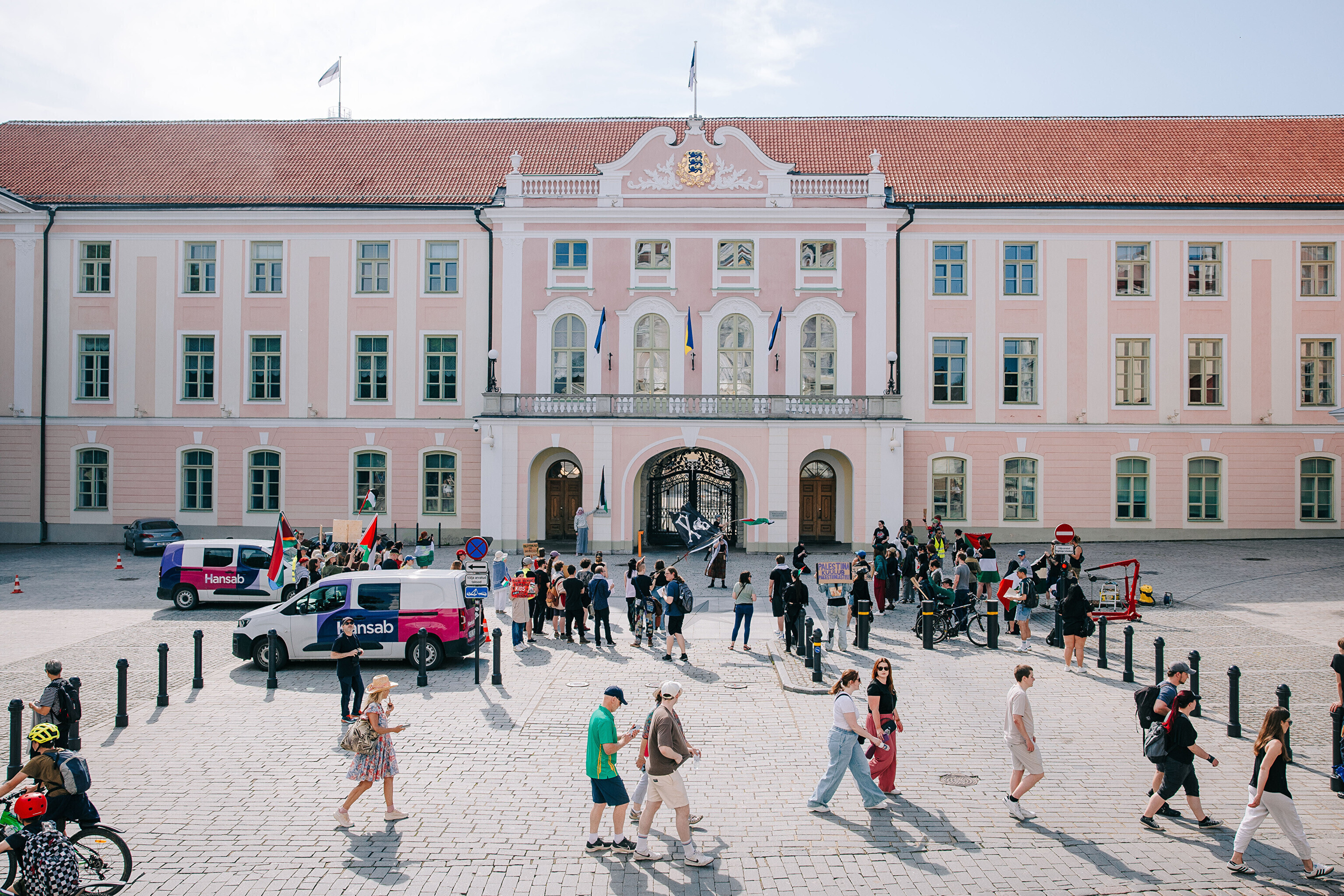 The protest began in front of the Ministry of Foreign Affairs, where speeches were delivered. From there, participants marched through Tammsaare Park, Town Hall Square in the Old Town, and Freedom Square to Toompea.