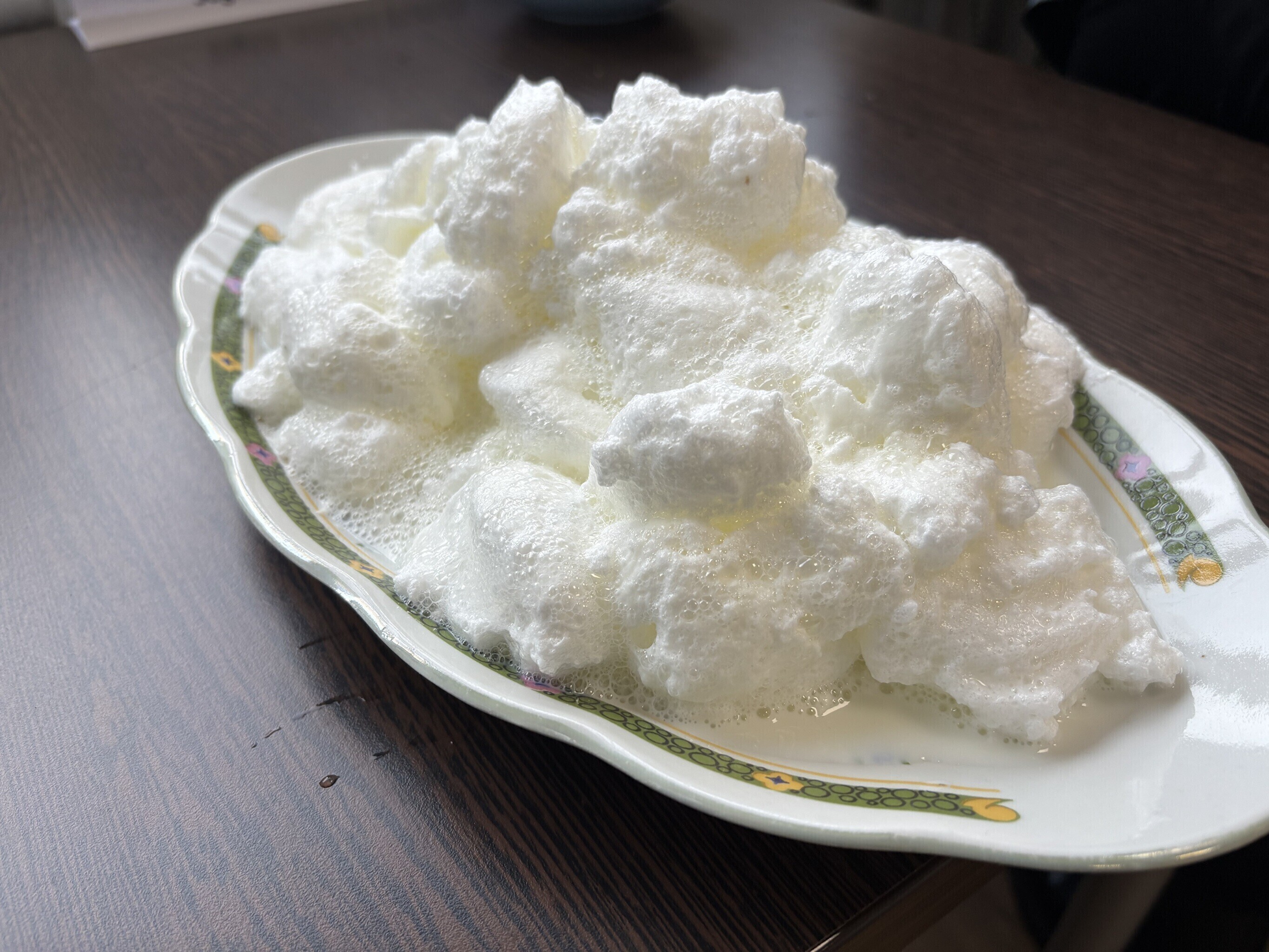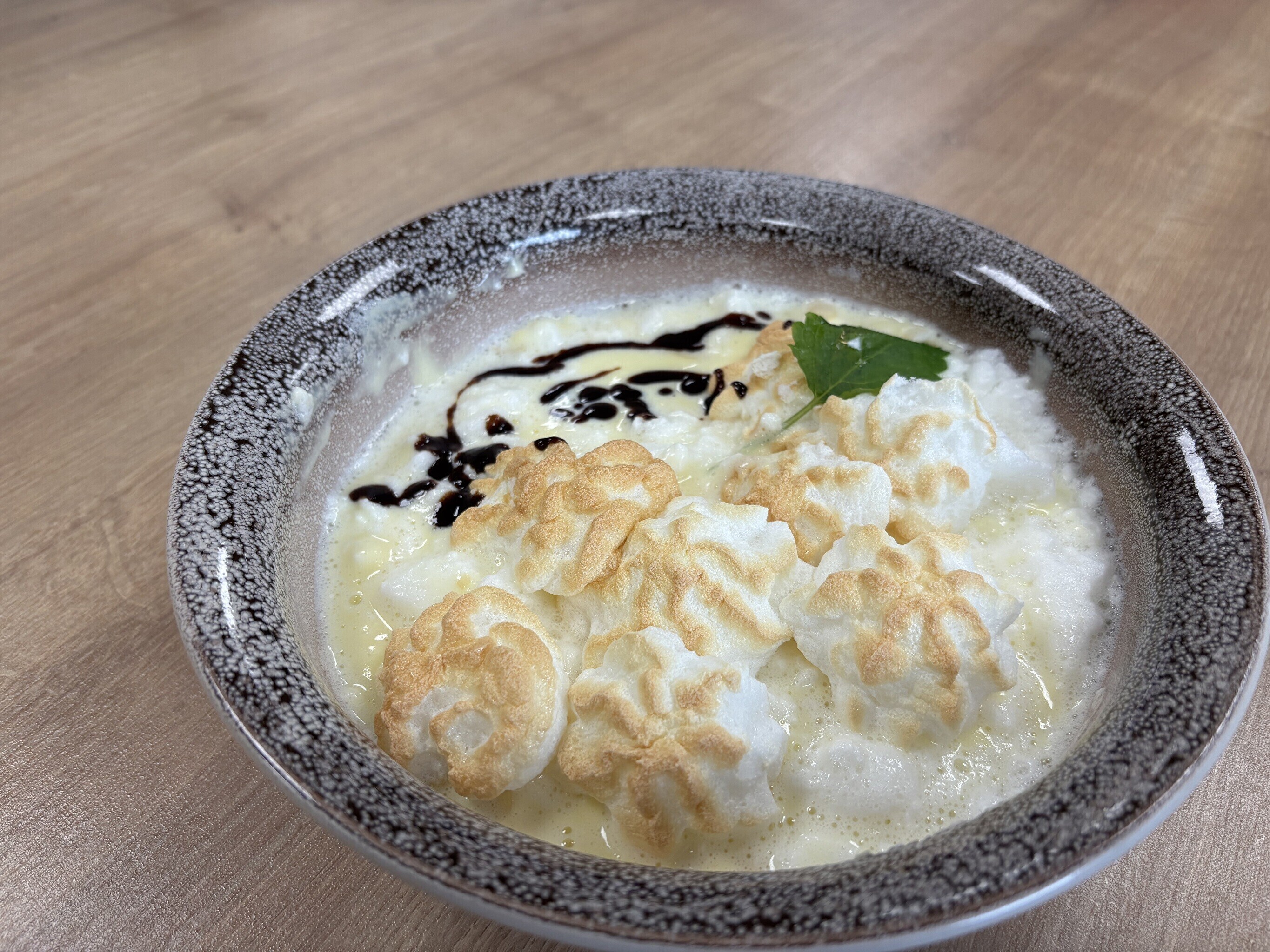 This is actually a desert rather than a savory broth, with "snowballs" of beaten egg whites and sugar floating atop a soup of boiled milk and egg yolks.