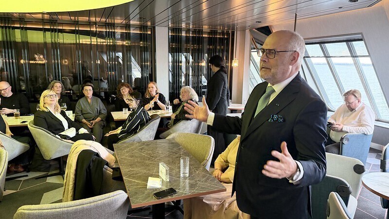 The Karises made the trip over on the Tallink MyStar ferry, and the president gave an on-board presentation.