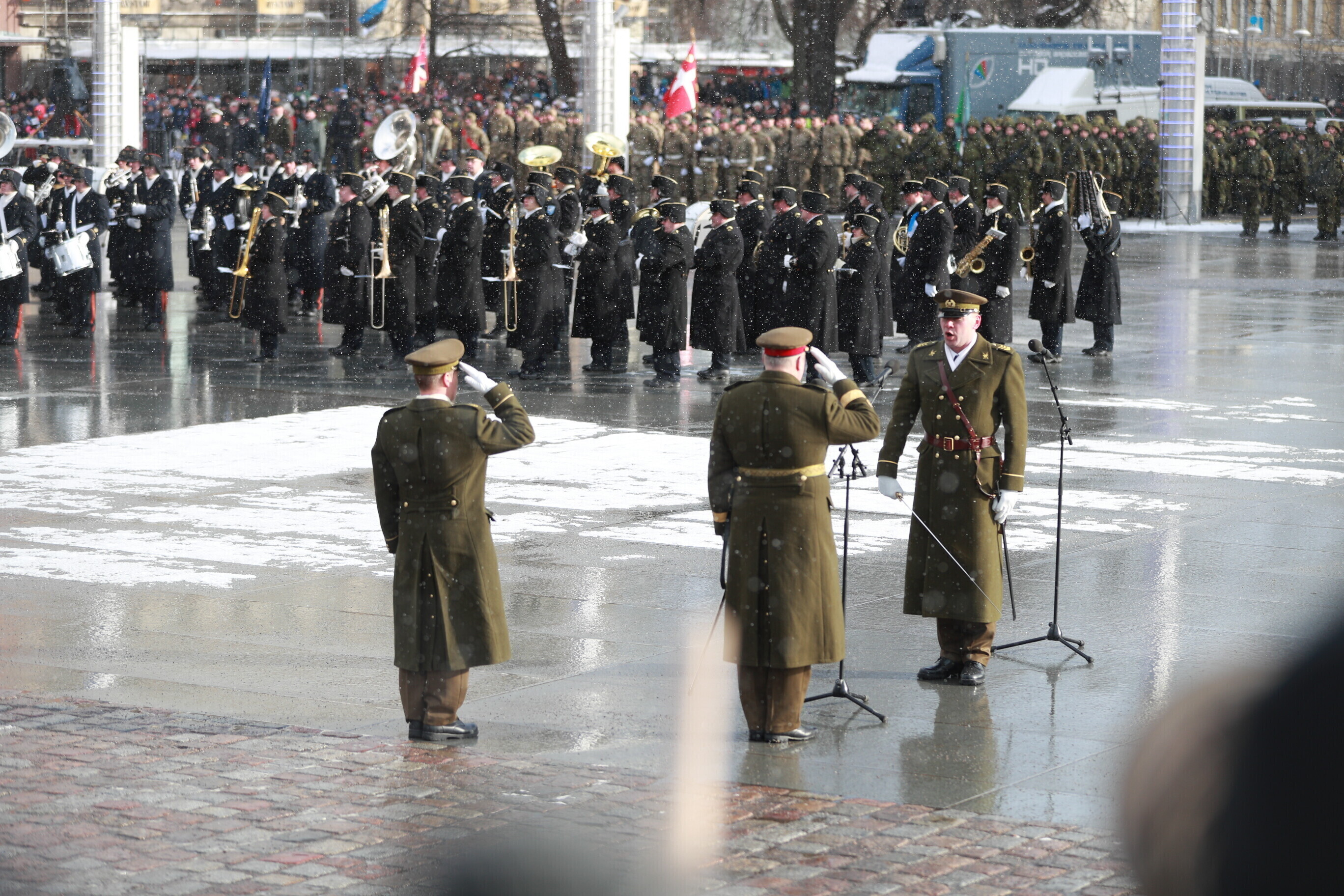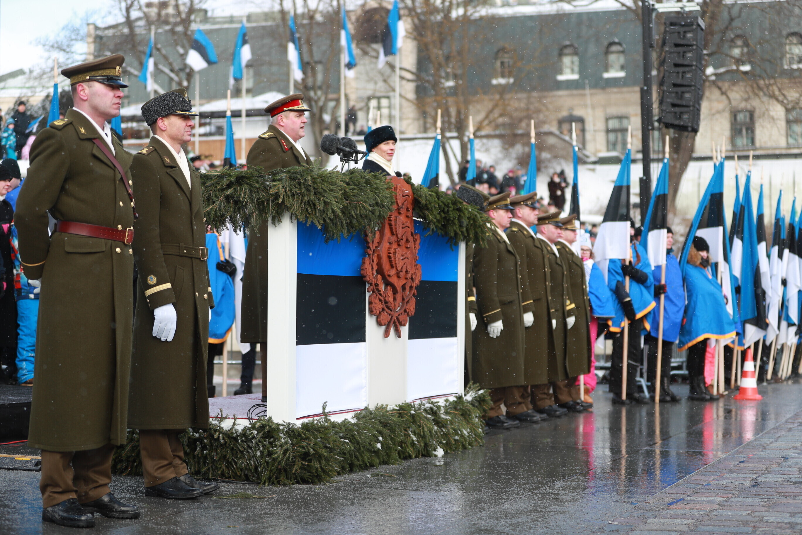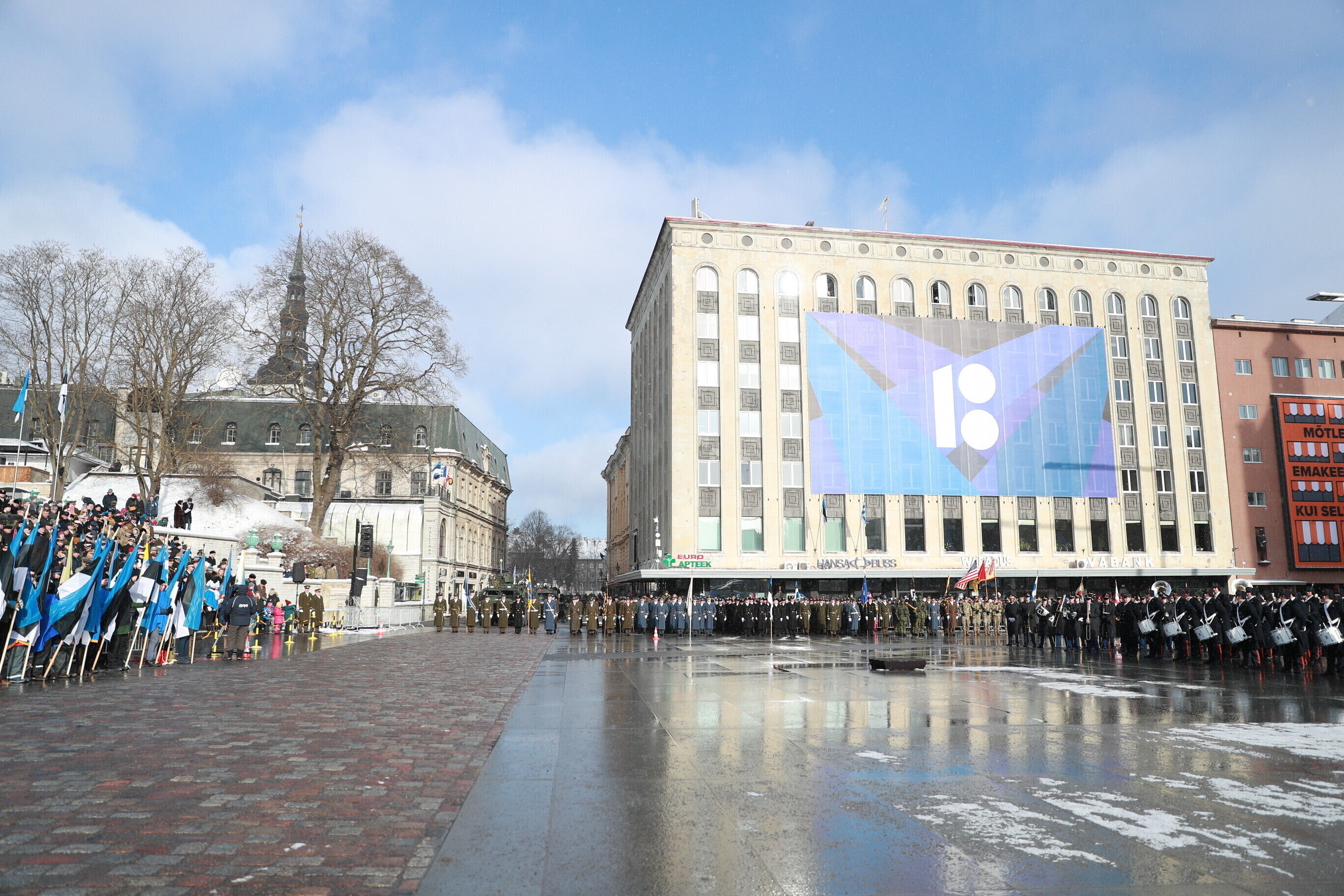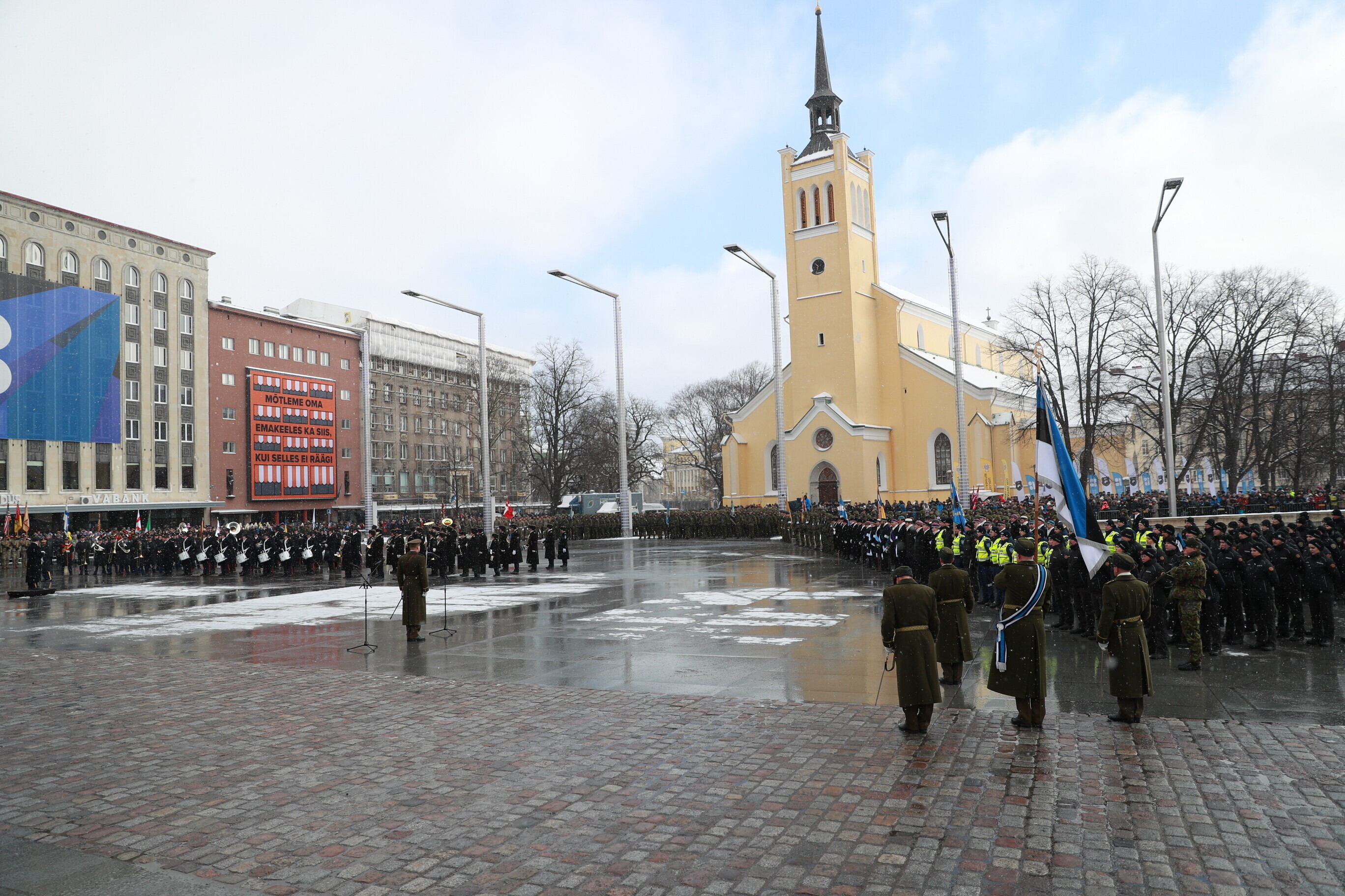 The occasion of the 100th anniversary of Estonian statehood was celebrated with a military parade on Tallinn's Freedom Square. The parade included some 1,100 participants and more than a hundred units of military equipment. The parade was led by Gen. Riho Terras, President Kersti Kaljulaid was present to greet the different units.