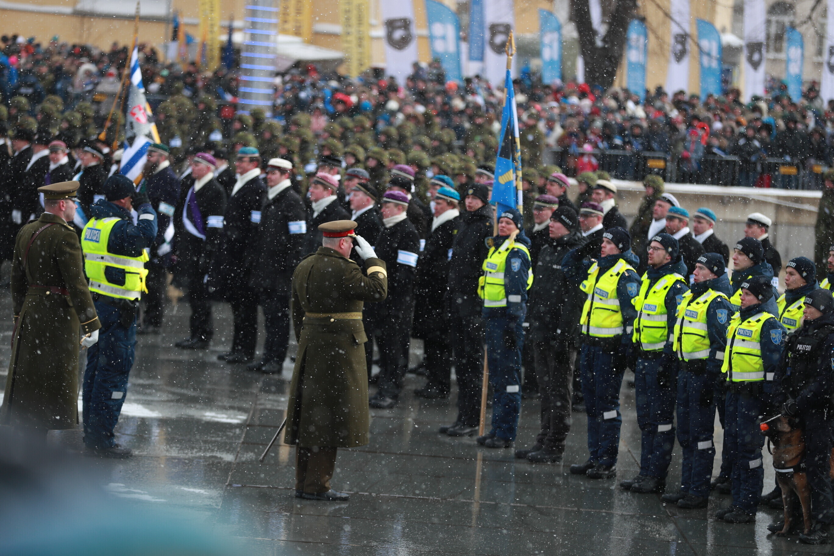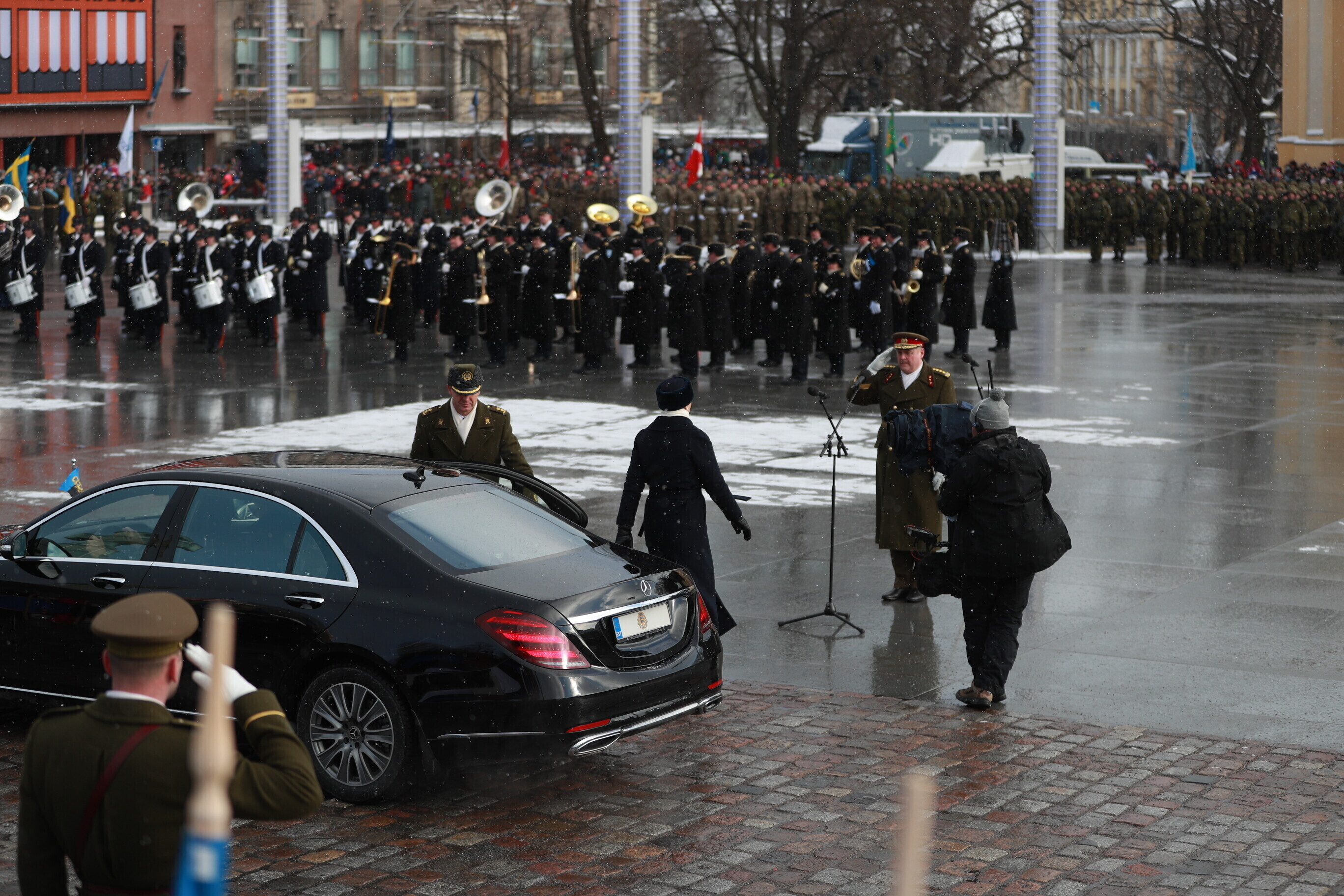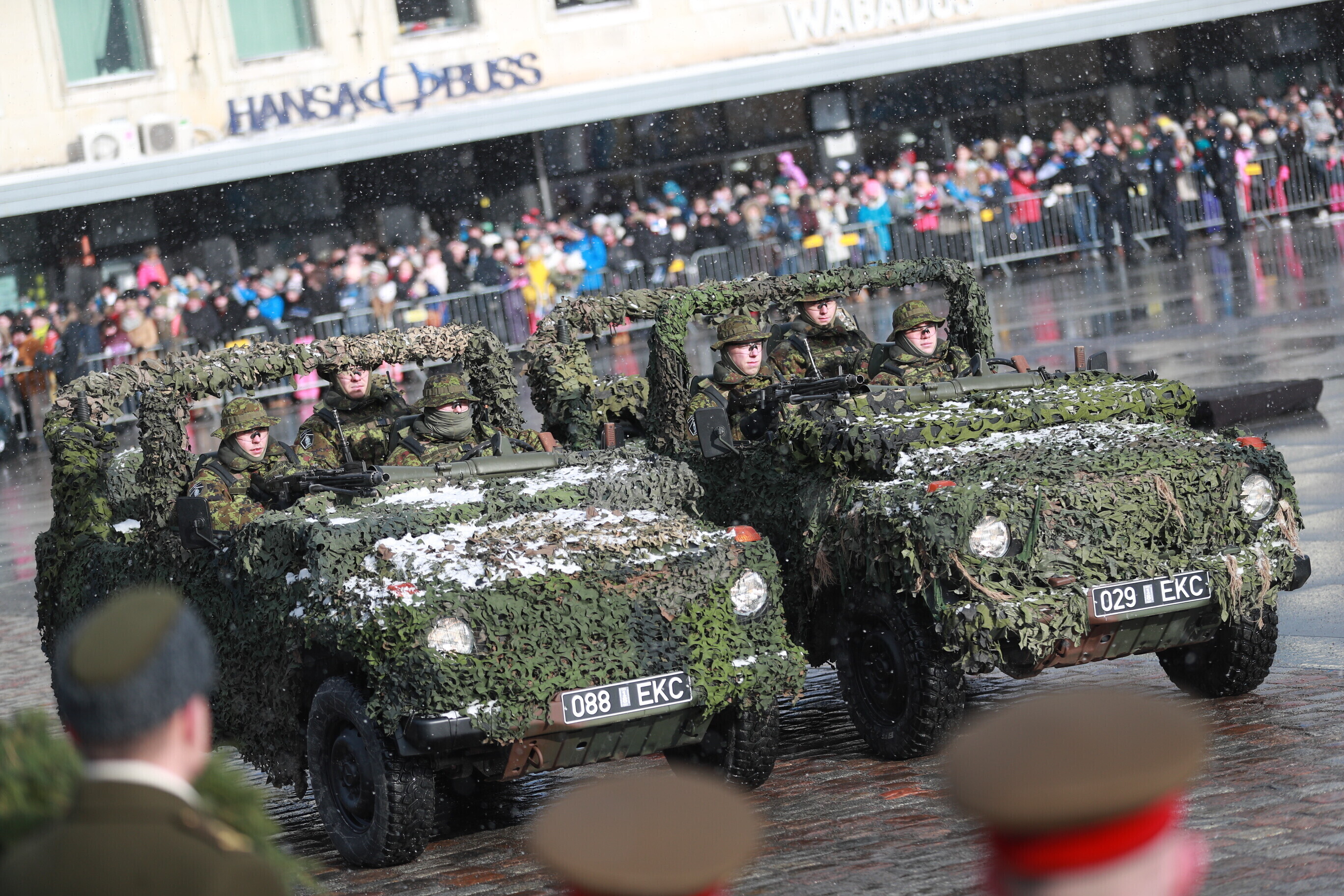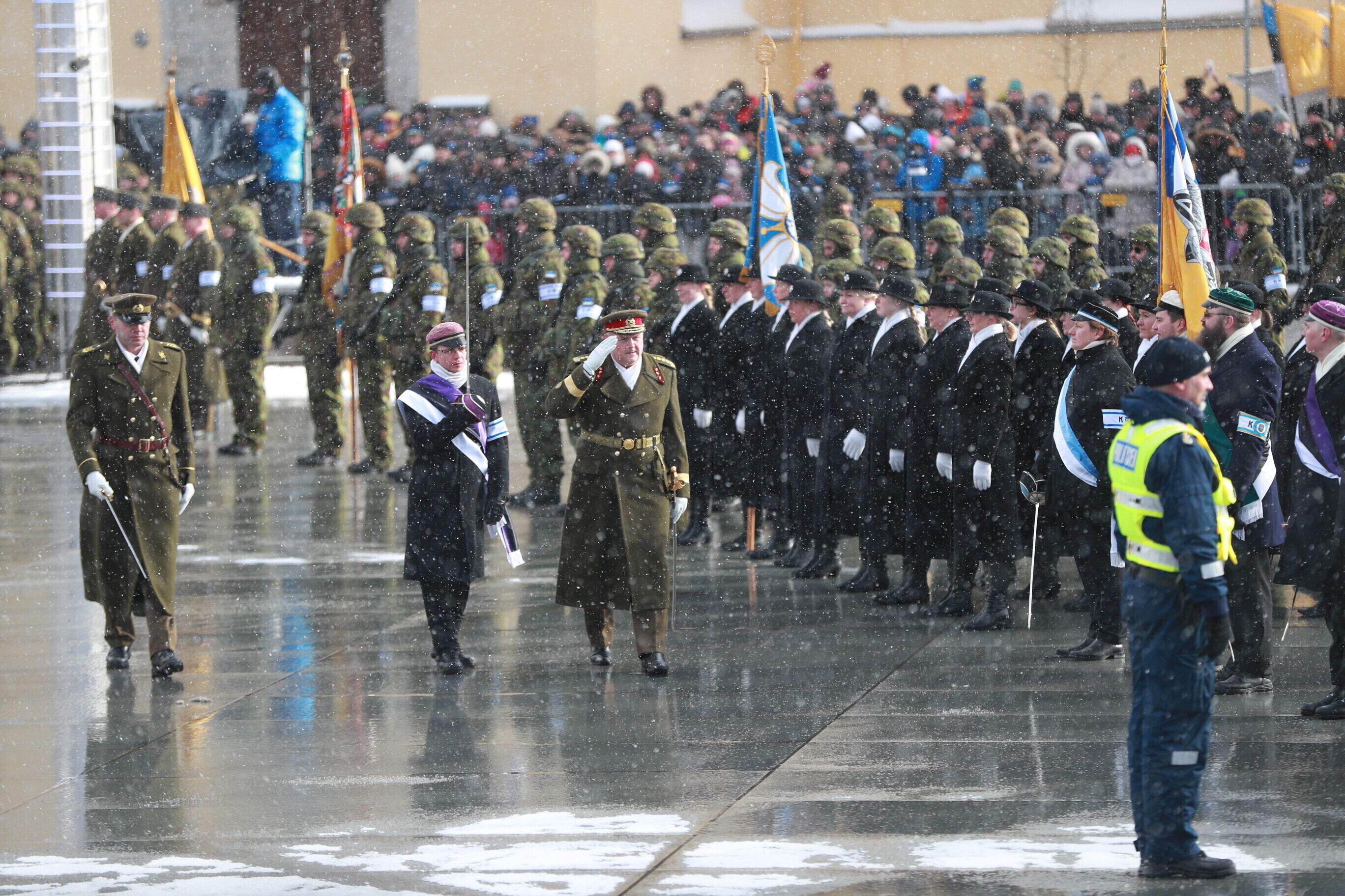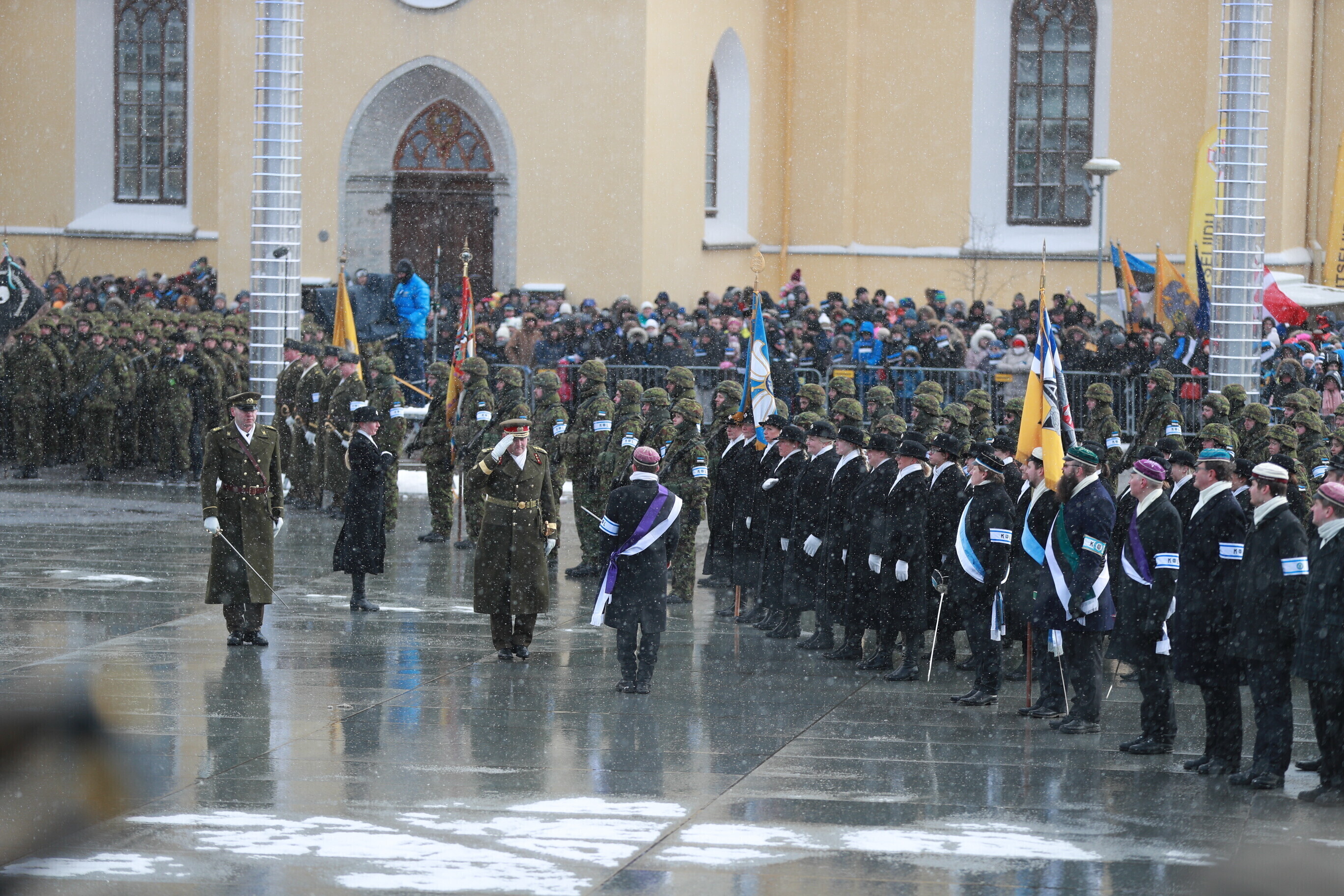 The occasion of the 100th anniversary of Estonian statehood was celebrated with a military parade on Tallinn's Freedom Square. The parade included some 1,100 participants and more than a hundred units of military equipment. The parade was led by Gen. Riho Terras, President Kersti Kaljulaid was present to greet the different units.