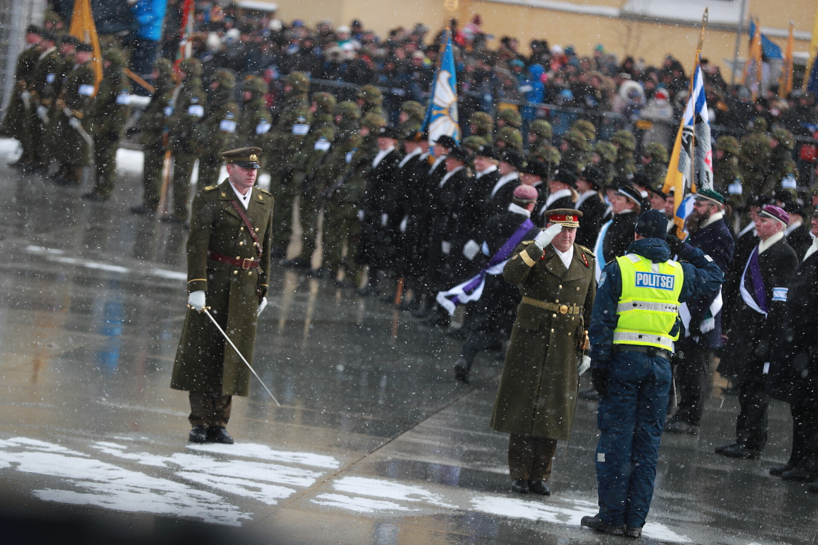 Estonia's NATO allies and other partners were represented as well, with officers of Finland, France, Georgia, Italy, Latvia, Lithuania, Poland, Sweden, Ukraine, Britain, Denmark, and the United States present. The British and Danish personnel marching in the parade belong to the two countries' units currently deployed to Estonia as part of the local NATO battle group.