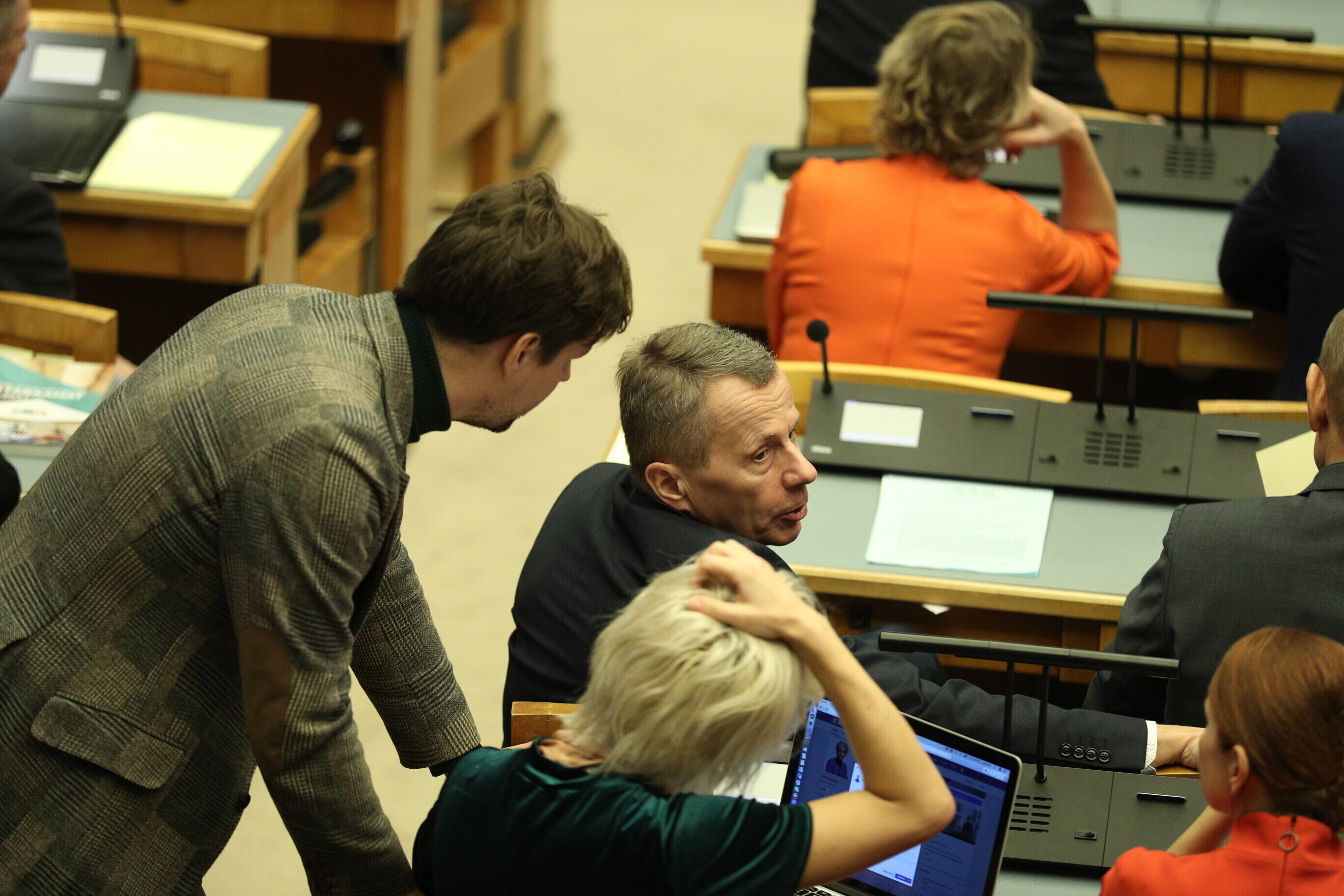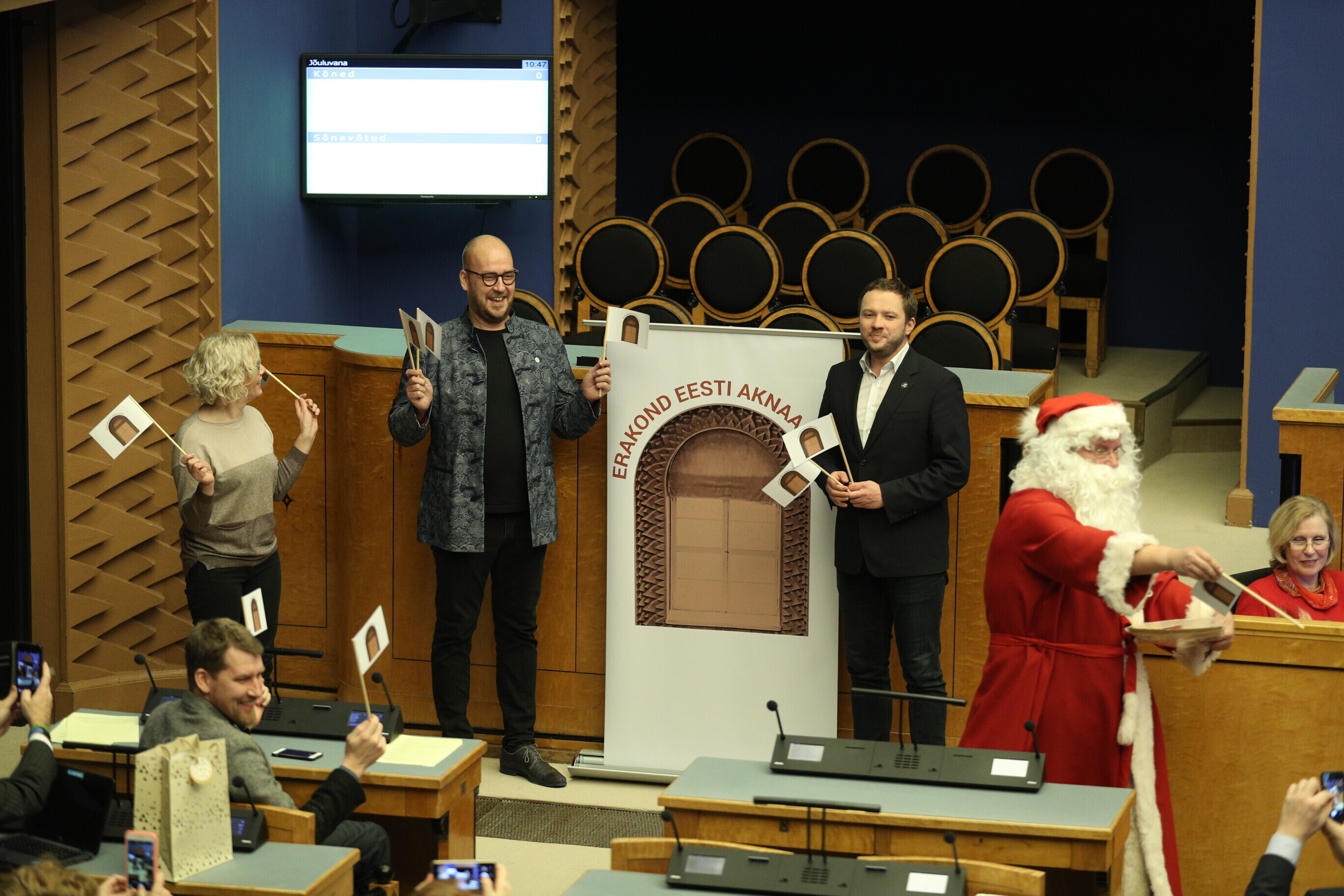 He also encouraged the independent MPs, who traditionally sit alongside the windows in the Session Hall, to establish yet another new political party, presenting them with a banner and promotional flags bearing a logo representing an ornately carved wooden Session Hall window frame together with a suggested name — the Estonian Under-the-Windows Party.