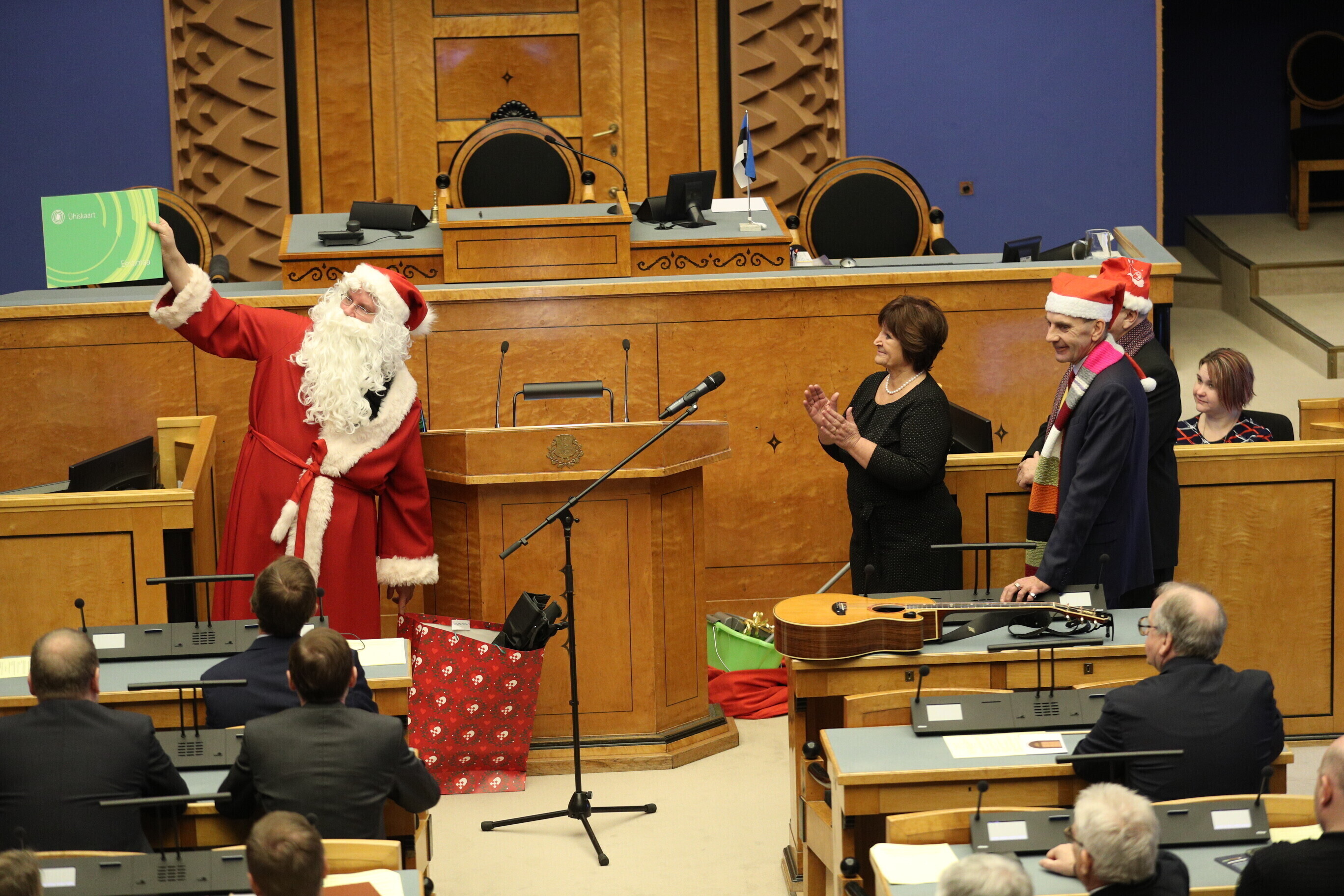 Accompanied by Märt Sults on the guitar, the coalition Centre Party sang a Christmas song, with a solo by Toomas Väinaste. Santa Claus presented them with an oversize green public transport card granting free transport throughout the country and an Estonian road atlas, paired with a folding camping chair that he said could be used when there are no free seats left on the bus.
