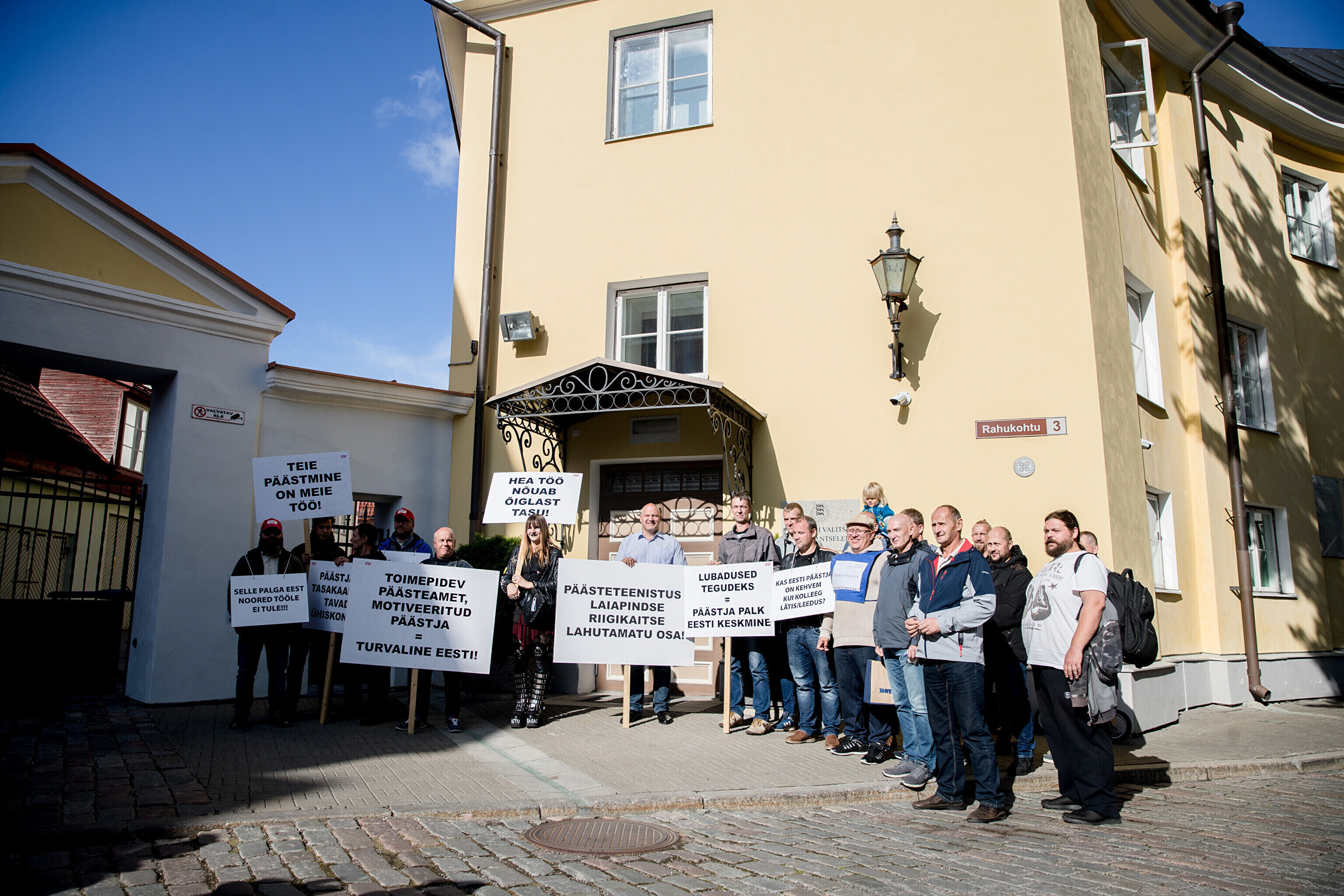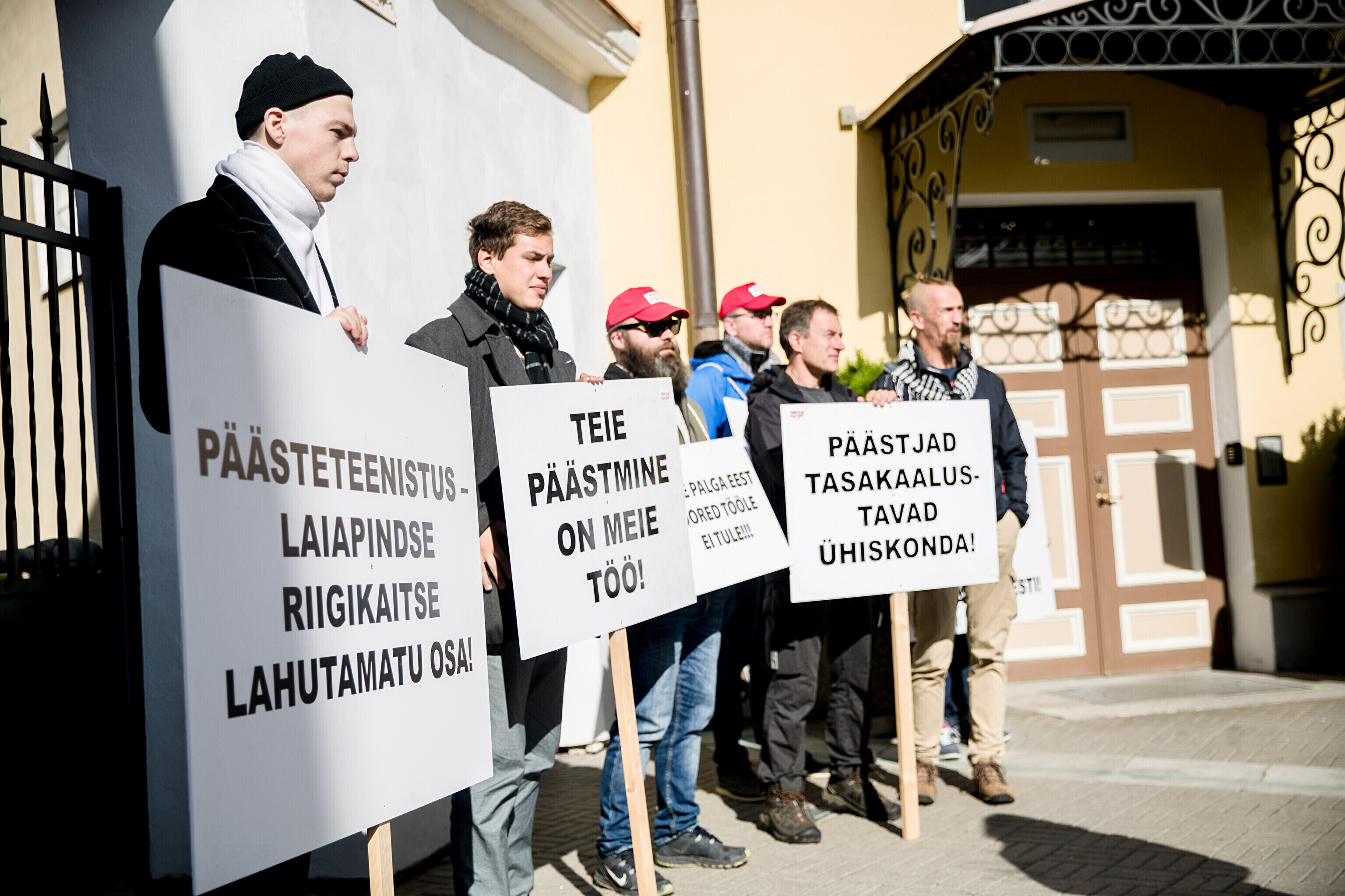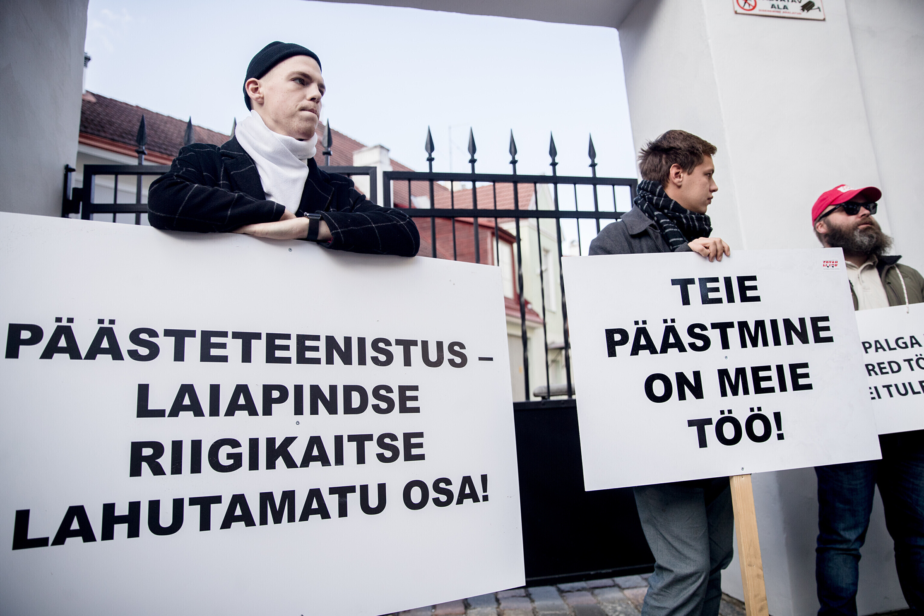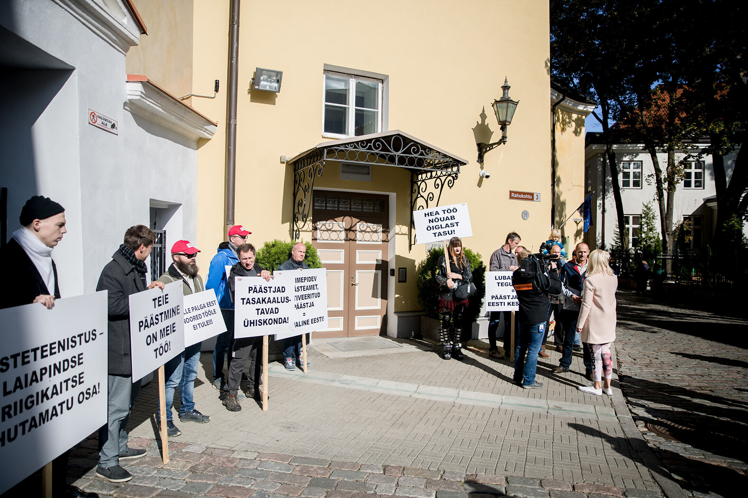 Rescue workers held a protest outside Stenbocki Maja (Stenbock House) at Toompea, Tallinn on Thursday as the government gathered at a cabinet session to discuss the state budget.